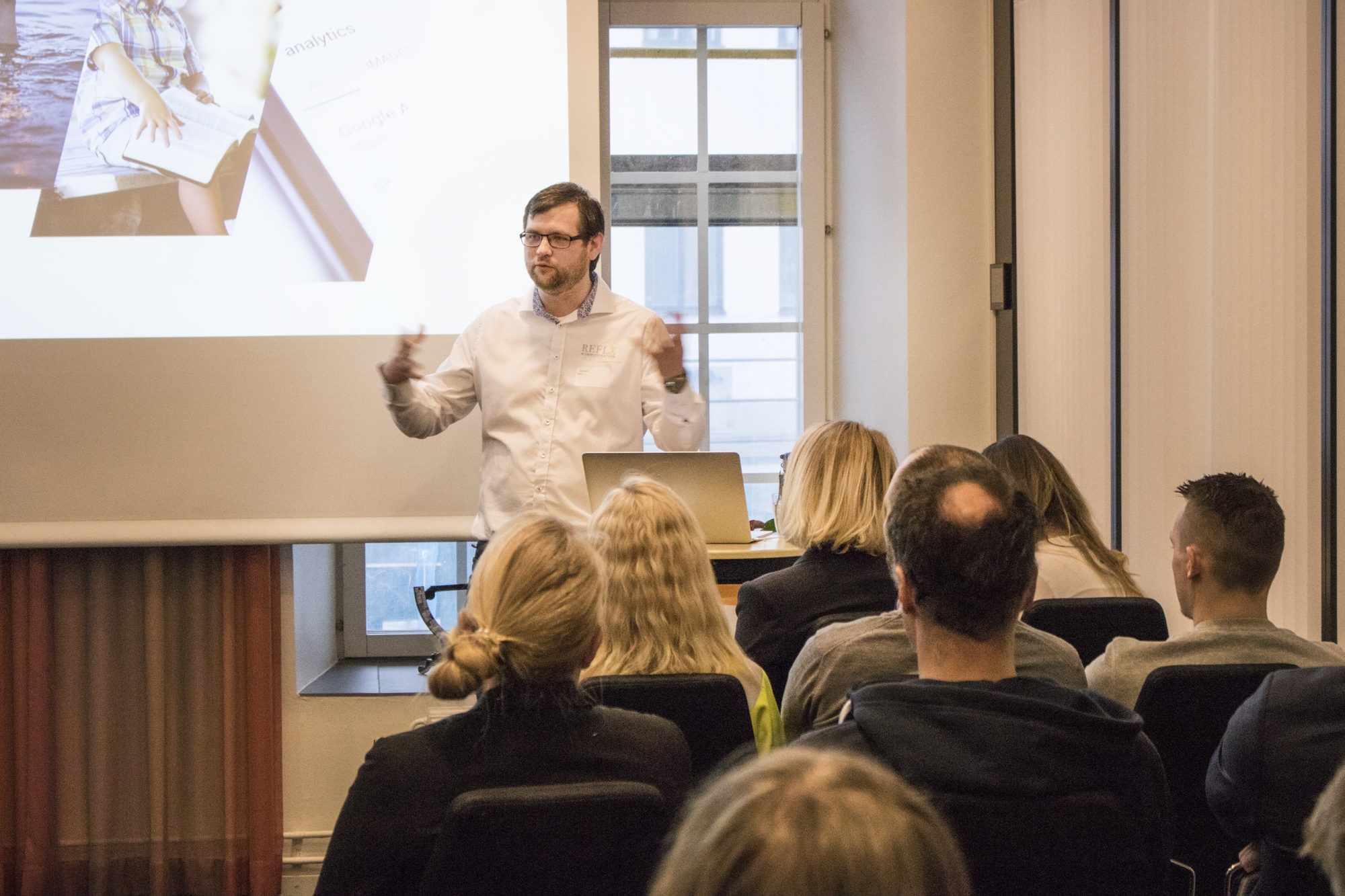 – Förr räckte det med att man hade en hemsida så var man häftig och man använde blinkande knappar och springande hundar – bara för att man kunde, sa Marcus och visade några gamla hemsideexempel  från början av 2000-talet. Ett skratt gick genom publiken då gamla minnen dök upp. Så är det inte idag – nu gäller det att ha rätt hemsida och fylla den med relevant innehåll, fortsatte Marcus.