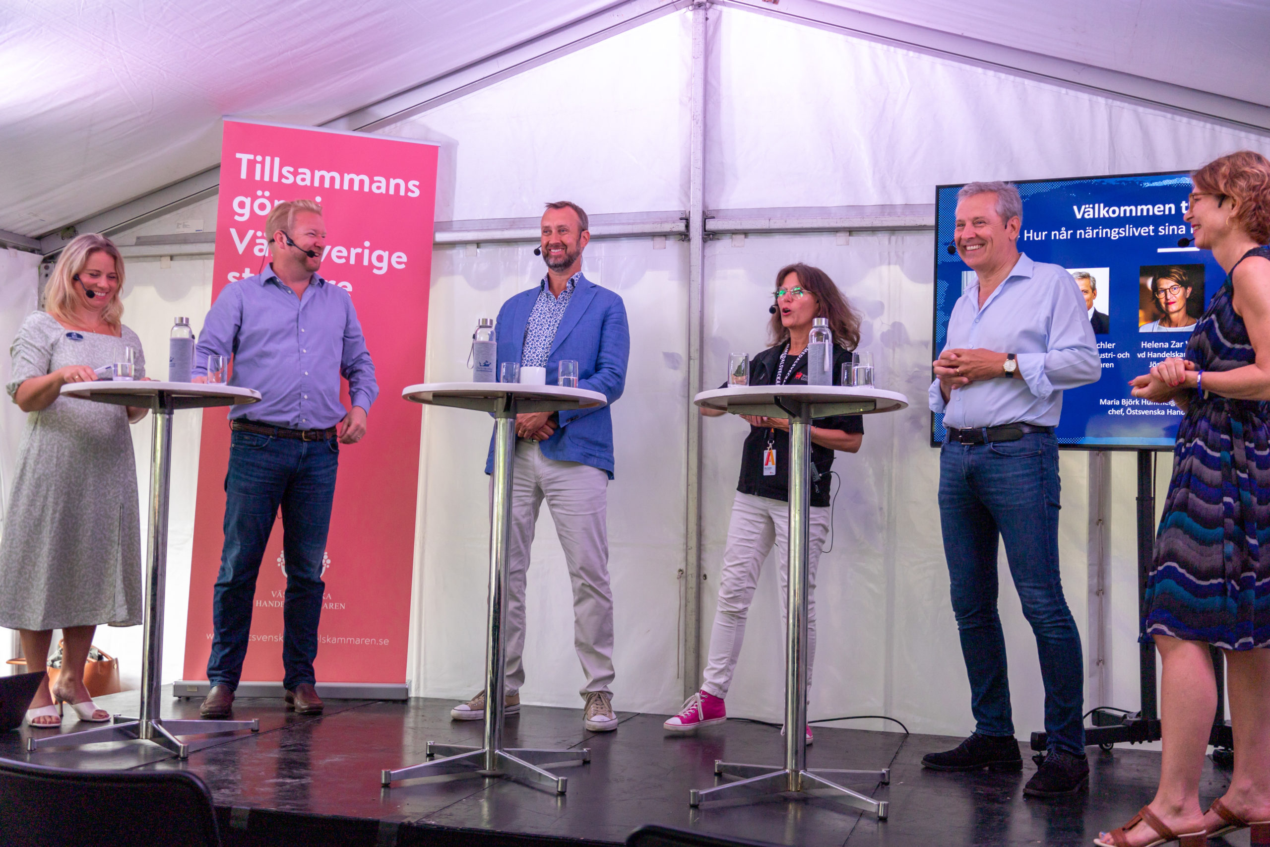 Handelskamrarnas vd:ar på scen: Från vänster: Moderator Maria Björk Hummelgren, näringspolitisk chef Öst, Simon Helmér från Öst, Johan Trouvé från Väst, Mia Stuhre, projektledare Almedalsveckan, Stephan Müchler från Syd och Helena Zar Vallin från Jönköpings.