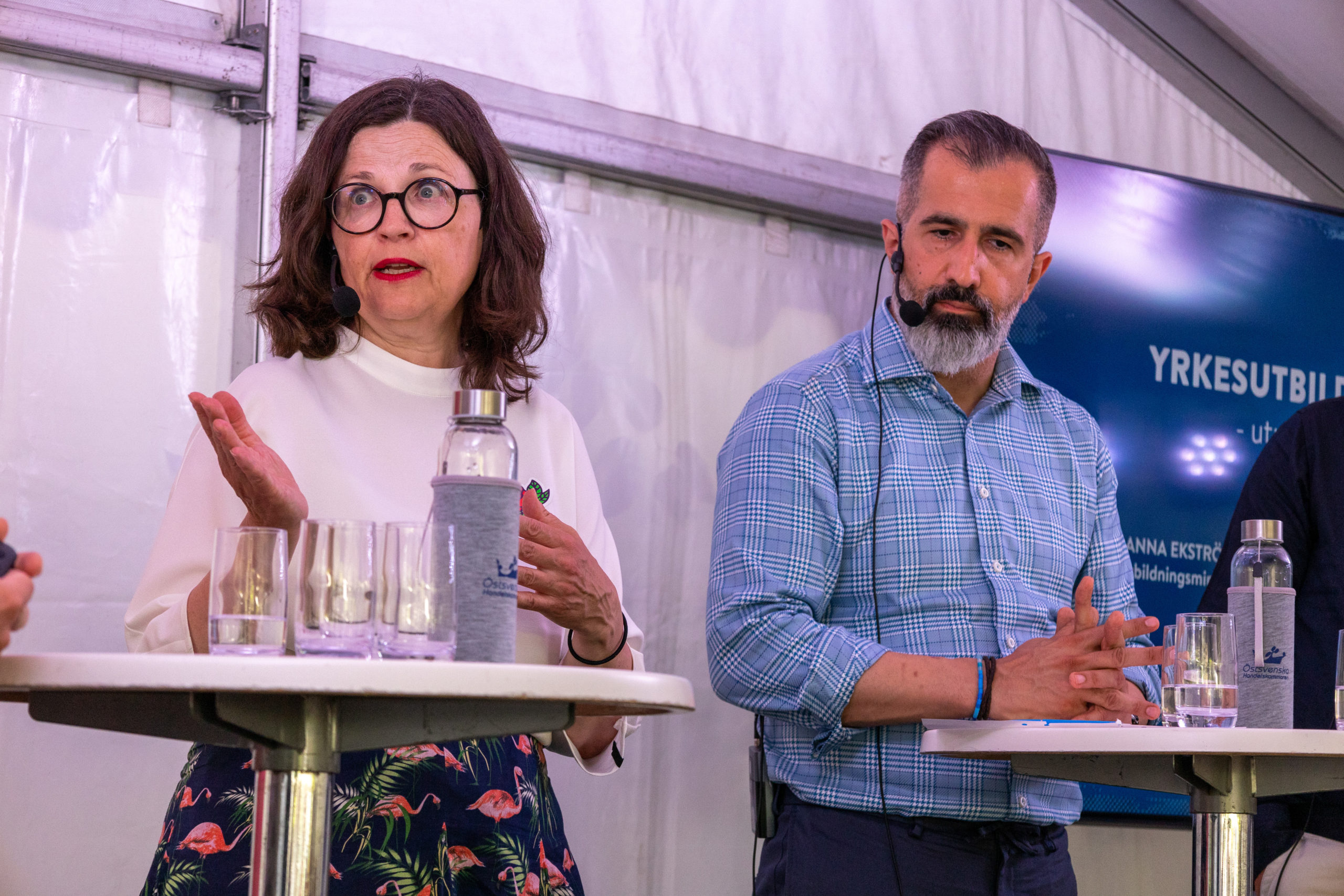 Anna Ekström (S), utbildningsminister och Alireza Akhondi (C), riksdagsledamot, Centerpartiet, under ett seminarium om yrkesutbildningarnas framtid.
