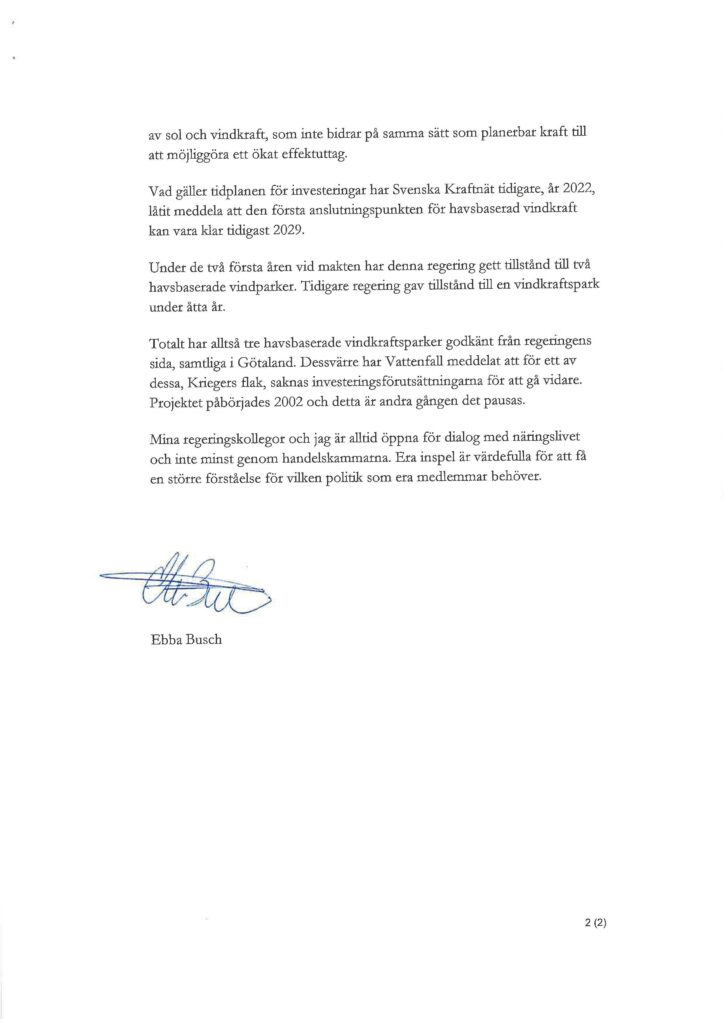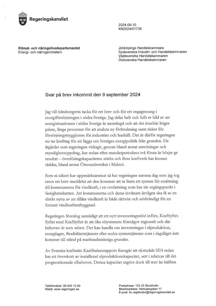 Ebba Busch har nu svarat och lyfter regeringens insatser för att förbättra elförsörjningen, inklusive ett nytt system för kommunal ersättning vid vindkraftsutbyggnad. Samtidigt meddelar hon att anslutningen för vissa vindkraftsprojekt kan ske först 2029, något som kan vara för sent enligt de södra handelskamrarna. Statsrådet pekade också på ett nytt investeringsstöd, så kallat Kraftlyftet, som ska öka elsystemets förmågor i regioner där behovet är som störst. Busch berättar att regeringen hittills gett klartecken till tre havsbaserade vindkraftsparker, men marknadsförutsättningarna för att genomföra dem är utmanande.