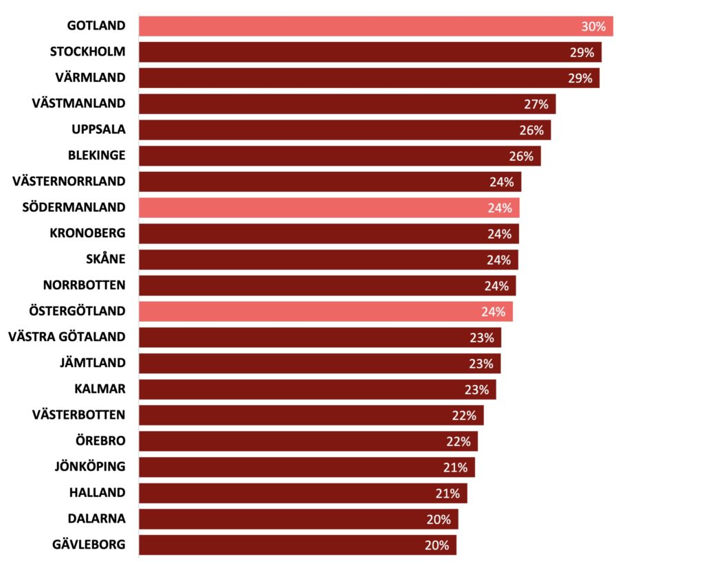 Så roligt att Gotland har nått hela 30 procent i år. Gotland har alltid legat i topp men aldrig med så mycket som i år. Östergötland och Sörmland har en knapp förändring sedan förra året på en procent upp respektive ned men tittar vi bakåt i tiden har samtliga län haft en klar förbättring sedan 2018, säger Jonna Hedlund.