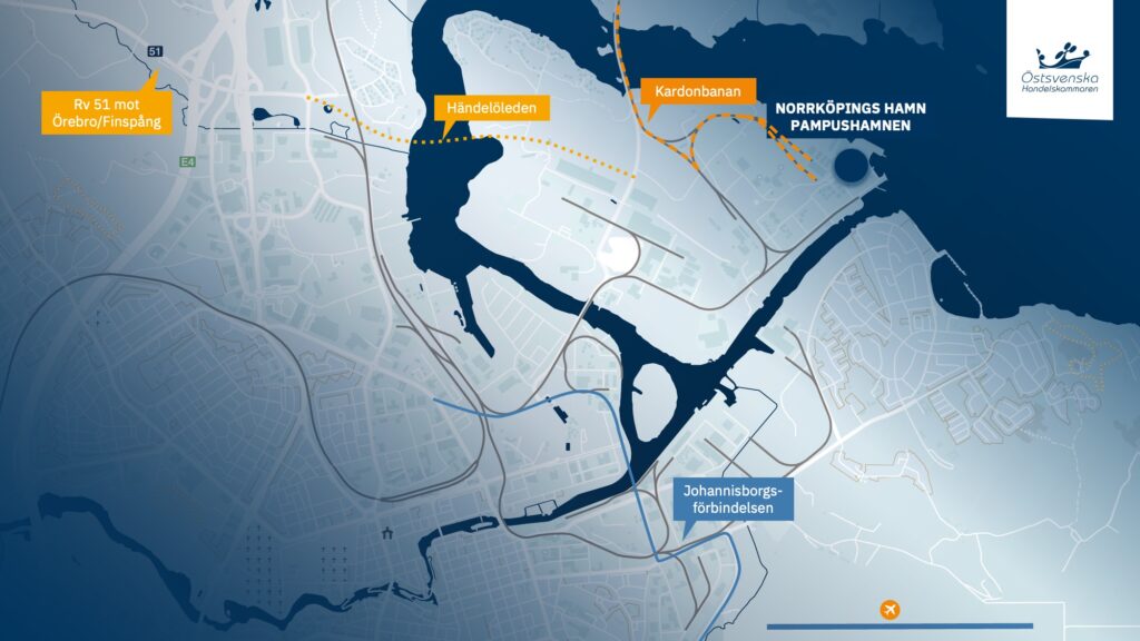 När svensk konkurrenskraft står på agendan, betonar Handelskammaren alltid kopplingen till regionens hamnar i Oxelösund och Norrköping. Att leden över Händelö på vägen från Örebro och Finspång är exempelvis kommer på plats är exempelvis helt avgörande för att tungt gods kan fortsätta fraktas från de stora industrierna vidare ut i världen.