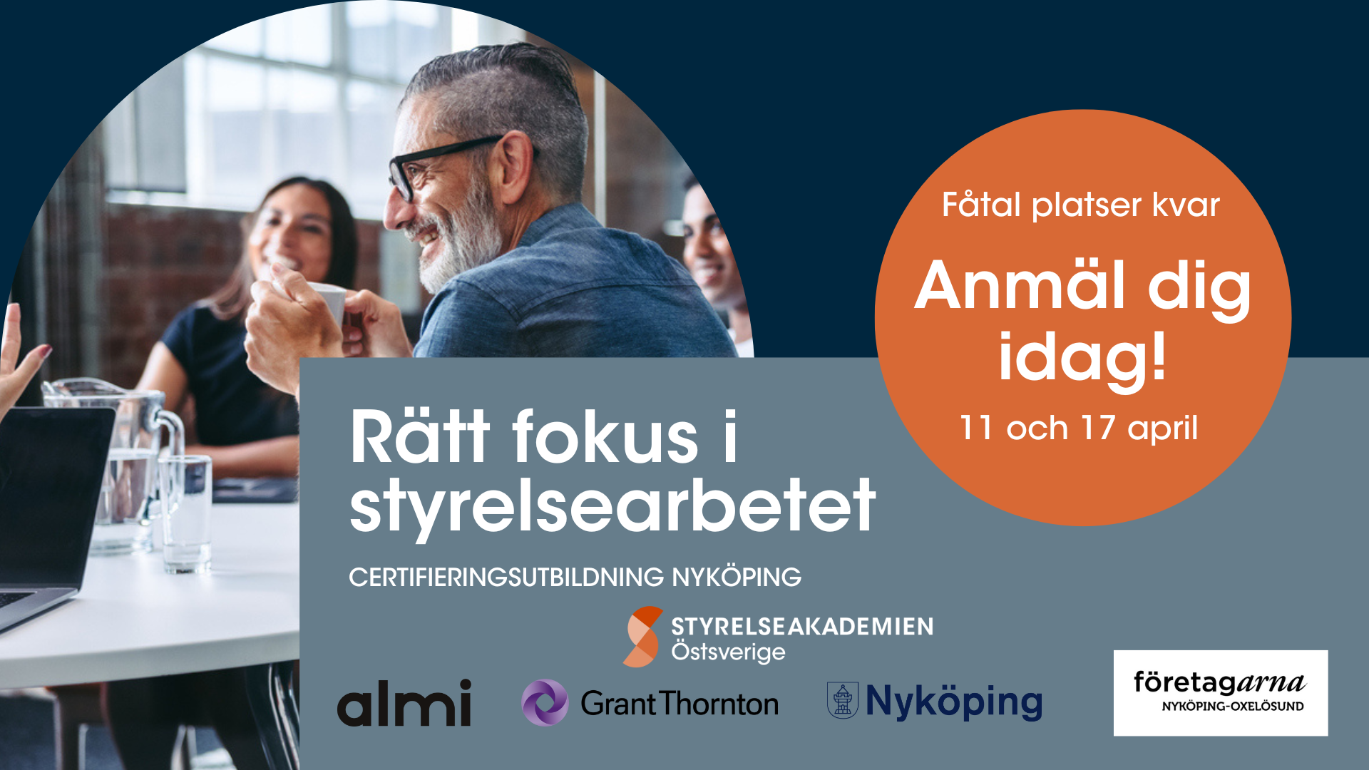 Varje år väljer mer än 1 000 personer gå Styrelseakademiens certifieringsutbildning Rätt fokus i styrelsearbetet är en branschledande styrelseutbildning och som genomförs på ett 20-tal orter i hela landet och online. Ge dig själv en kvalitetsstämpel, utbildningen ger dig grunderna och verktygen, så att du på ett professionellt sätt kan bidra till att utveckla bolagets lönsamhet och prestation på lång sikt.