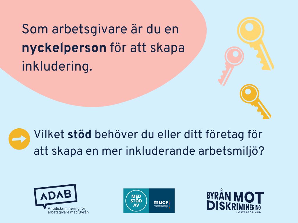 Vi på Byrån mot diskriminering i Östergötland sitter på kunskaper och erfarenheter som kan bidra till detta viktiga arbete. Oavsett om ni har koll på lagkraven och driver ett utvecklat förebyggande arbete mot diskriminering eller om ni vill komma i gång så guidar vi er gärna genom såväl det juridiska som att skapa ett tryggt och öppet samtal om potentiellt svåra frågor.