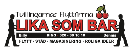 https://likasombar.com/Flyttfirman Lika som Bär startades 2012 av tvillingarna Billy och Dennis. Med idag 25 anställda och 5000 flyttar i bagaget representerar Lika som Bär det moderna företagandet som ger alla människor chansen. Bemötande i världsklass, ansvar och alla människors lika värde är värdegrunden som vi lever efter varje dag. Vi ser fram emot att hjälpa dig med flytt, städ och magasinering. Välkommen till oss!