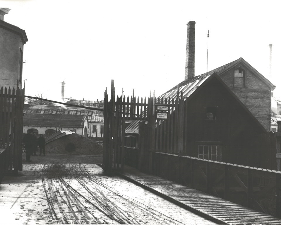 När fabrikerna fortfarande var i full drift fick bara de personer komma in på området som jobbade i Strykjärnet och de andra textilindustrierna. Att du hade rätt att vara där kontrollerades i en vaktkur till vänster efter Holmbron. Även om vakten är borta idag finns grindarna fortfarande kvar – men nu står de alltid öppna och museet välkomnar besökare alla dagar i veckan!