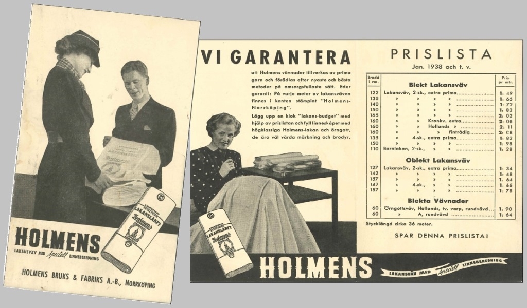 På Laxholmstorget stod den nu rivna ångcentralen med sin höga skorsten. Därifrån pumpades ånga in i fabriken för att hålla bomullsfibrerna fuktiga och hållbara i vävningen. Bland annat tillverkade Holmen tyg till populära lakan som lovades hålla så länge att ”de äro väl värda märkning och brodyr” som det står i ett reklamblad från 1938.