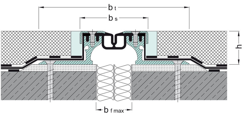 Högbelastbar, stabil konstruktion som ger en mycket långsiktig lösning på en rörelsefog i en mycket utsatt miljö. Lämplig för rörelsefogar i P-hus, garage, gångbroar, ramper, terminaler mm.