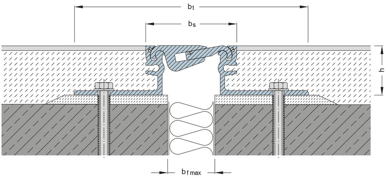 Modell Fogbredd max mm. Max rörelse mm Bryggans synliga bredd mm Bryggans totala bredd mm. Installationshöjd mm. Belastbarhet lastbilar (DIN 1072) kN Belastbarhet truckar med luft eller gummihjul (DIN 1055) kN Belastbarhet truckar med hårda hjul kg/mm hjulbredd