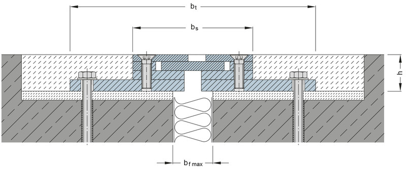 | Modell | Fogbredd max mm. | Max rörelse mm | Bryggans synliga bredd mm | Bryggans totala bredd mm. | Installationshöjd mm. | Belastbarhet lastbilar (DIN 1072) kN | Belastbarhet truckar med luft eller gummihjul (DIN 1055) kN | Belastbarhet truckar med hårda hjul kg/mm hjulbredd |