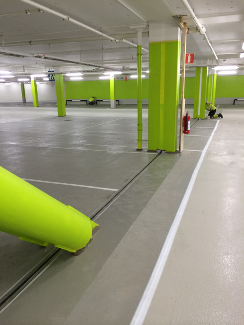 I galleriagångarna och butikerna ligger Migutrans FSL 104. I parkeringsgaragen användes Migutan FP 90.