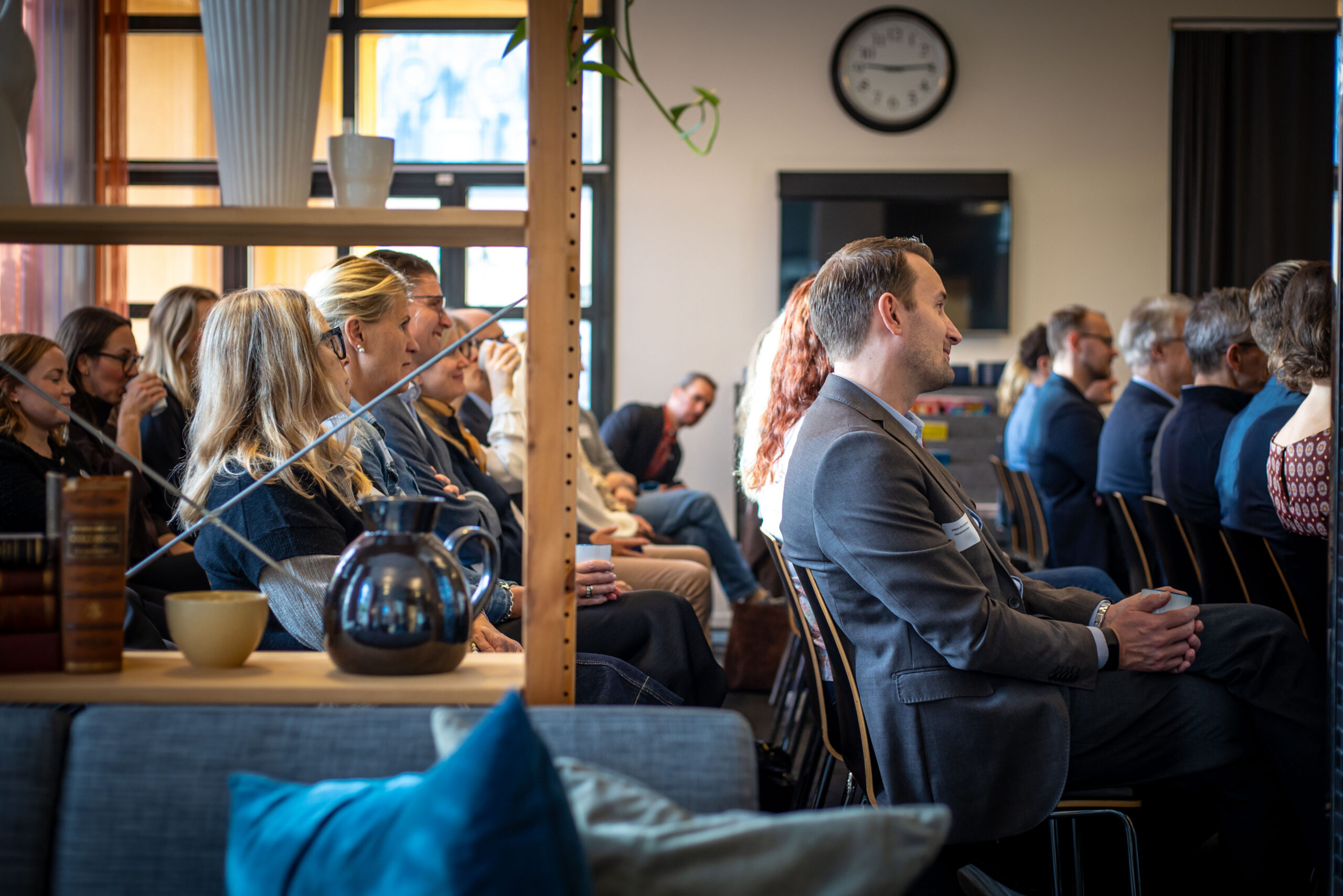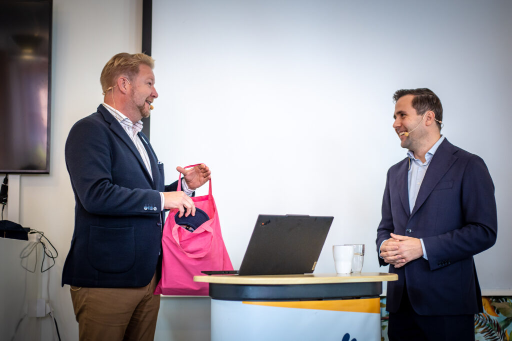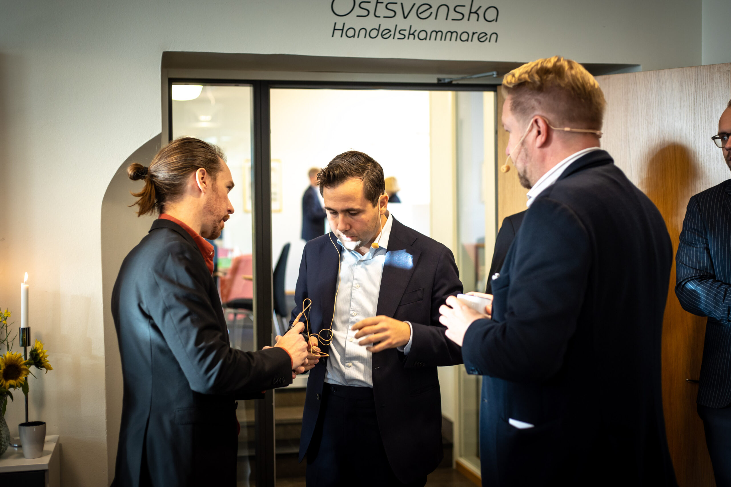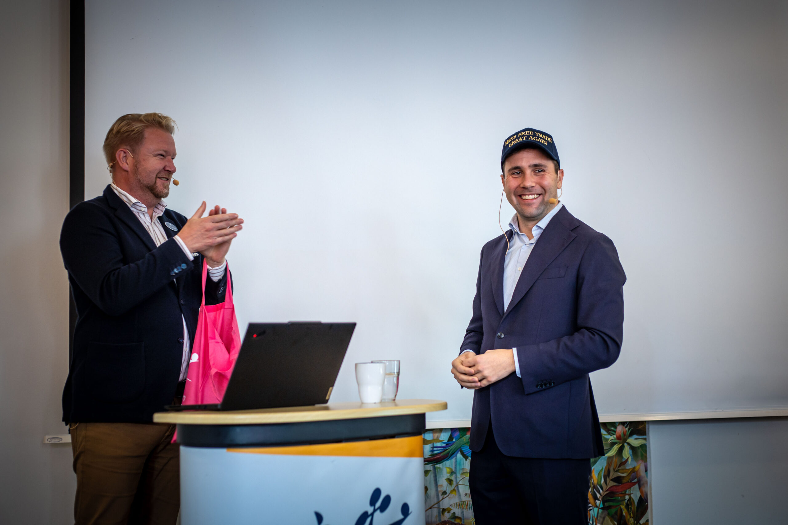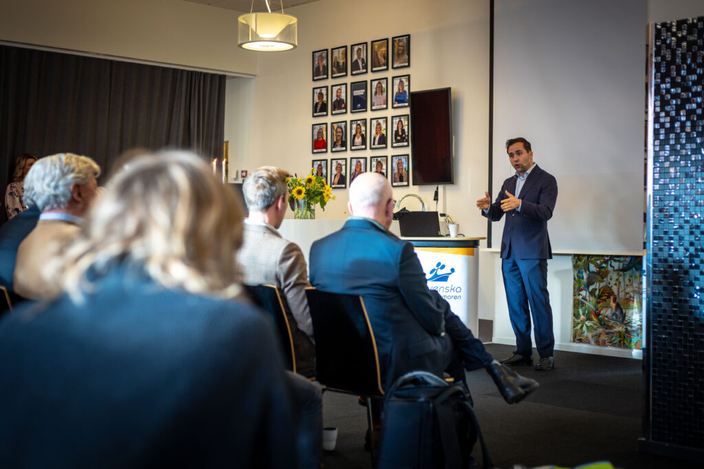 Benjamin Dousa (M), av vd Simon Helmér dubbad ”vår minister”, har på kort tid blivit en av landets mest namnkunniga politiker. Detta inte minst i ljuset av de så kallade Trump-tullarna som givetvis också var ett av de ämnen som ministern behandlade i sin dragning. Under mötet fick det besökarna i det fullsatta Kammarforum också möjlighet att ställa frågor till Benjamin.