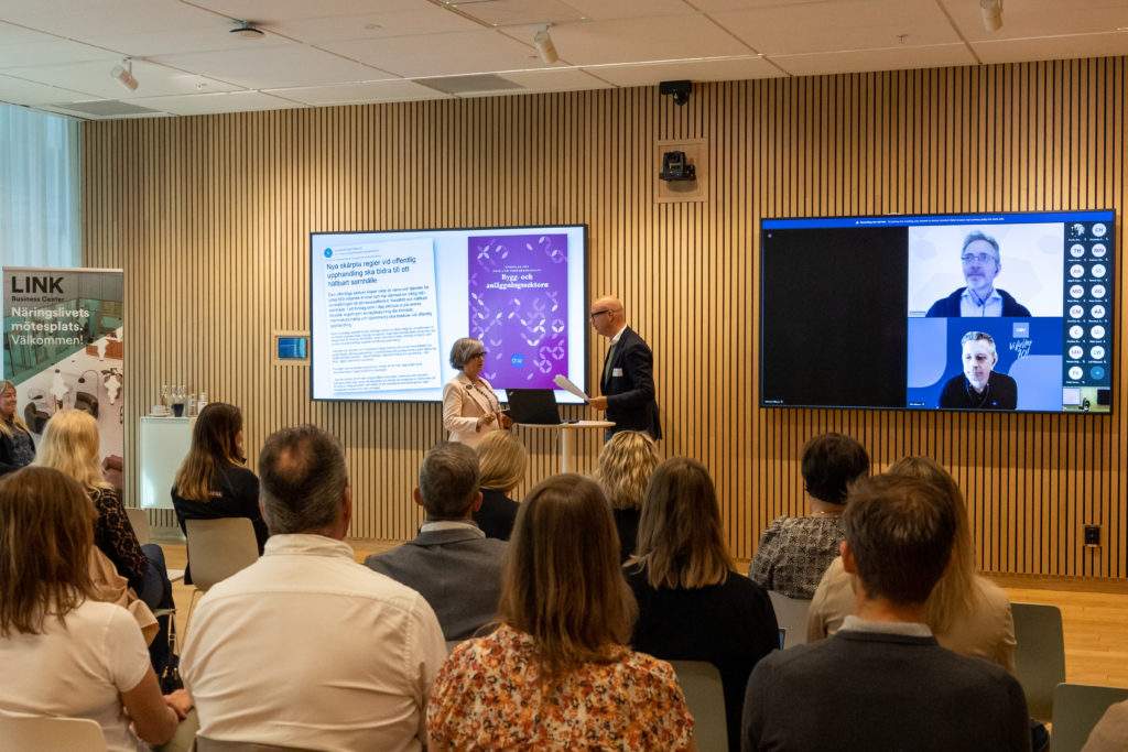 Regeringen har skickat ut ett remissförslag som innehåller lagskärpning där klimat, människors hälsa och djuromsorg ska beaktas vid offentliga upphandlingar. Där och då uppfattade jag och Cleantech Östergötlands vd Johan Rydberg detta som att flera krav skulle gå från bör till skall och vi blev förstås både hoppfulla och nyfikna. Vad skulle det innebära för våra medlemmar och klimatet framöver? Nu verkar promemorian inte ha drivits vidare så hårt på grund av rådande världsläge – men tanken finns, den är god och den lever vidare. Därför ordnade Östsvenska Handelskammaren/ESIC och Cleantech Östergötland en förmiddagsträff på tema upphandling med fokus på bygg, för minskat klimatavtryck genom styrning och inköp.