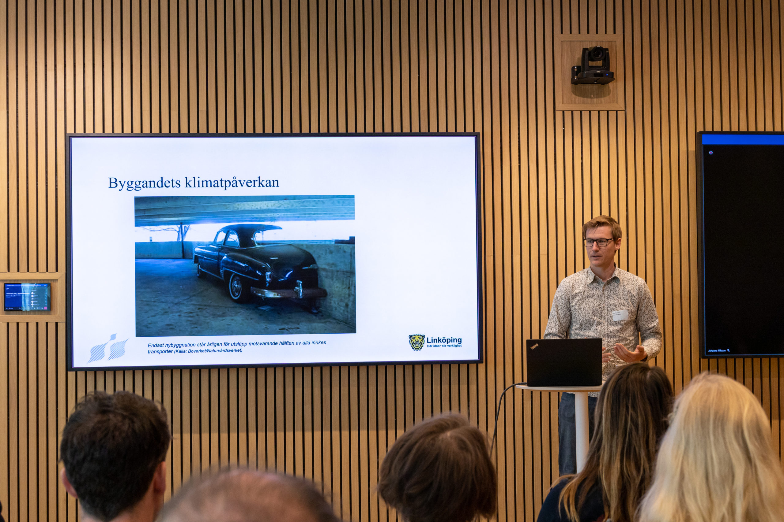 Mikael Sonesson från Linköpings kommun redogjorde för den trähuspolicy som kommunen tagit fram, för att stimulera till mer trähusbyggnation som ett sätt att minska CO2-utsläpp.
