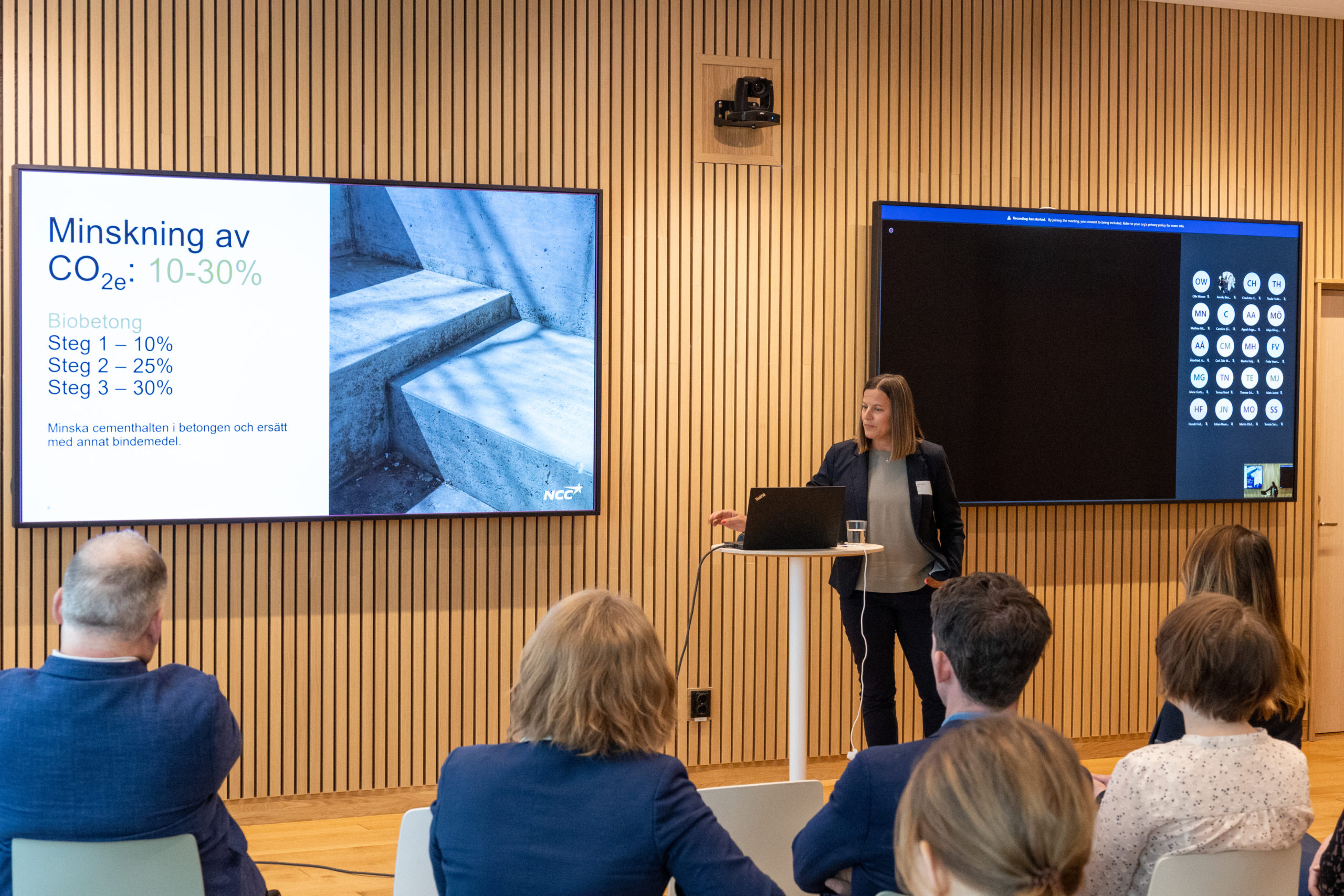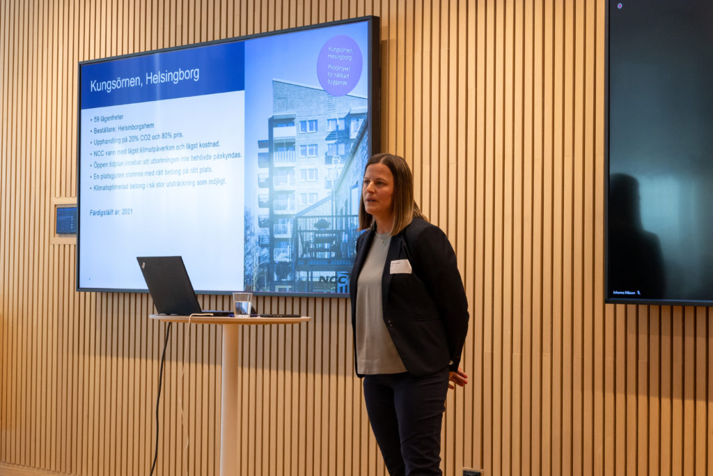 Från och med april är all färsk betong som används i NCC:s husbyggnadsprojekt klimatförbättrad till steg 1, vilket ger minst 10 procent i utsläppsbesparing. Steg 2 och steg 3 betyder en minskning om 25 respektive 25 procent. Hur gör man det? Jo, genom att minska cementhalten i betongen och ersätta med annat bindemedel som flygaska eller spill som är restprodukter från andra industriella processer. Ju högre steg, desto dyrare betong. Men bättre för miljön! Och genom att optimera och planera för en slimmad och resurssnål konstruktion redan i ett tidigt skede, så minskar användningen och kostnaden blir inte så stor som man tror. Använd inte mer betong än vad som behövs, använd rätt betong på rätt plats och gjut vid rätt tidpunkt på året, uppmanade Camilla. Då kan ett betonghus bli lika klimatsmart som ett trähus, sade hon och verifierade detta med ett diagram, hämtade från en uträkning gjord inom LFM30 – lokal färdplan Malmö 2030.
