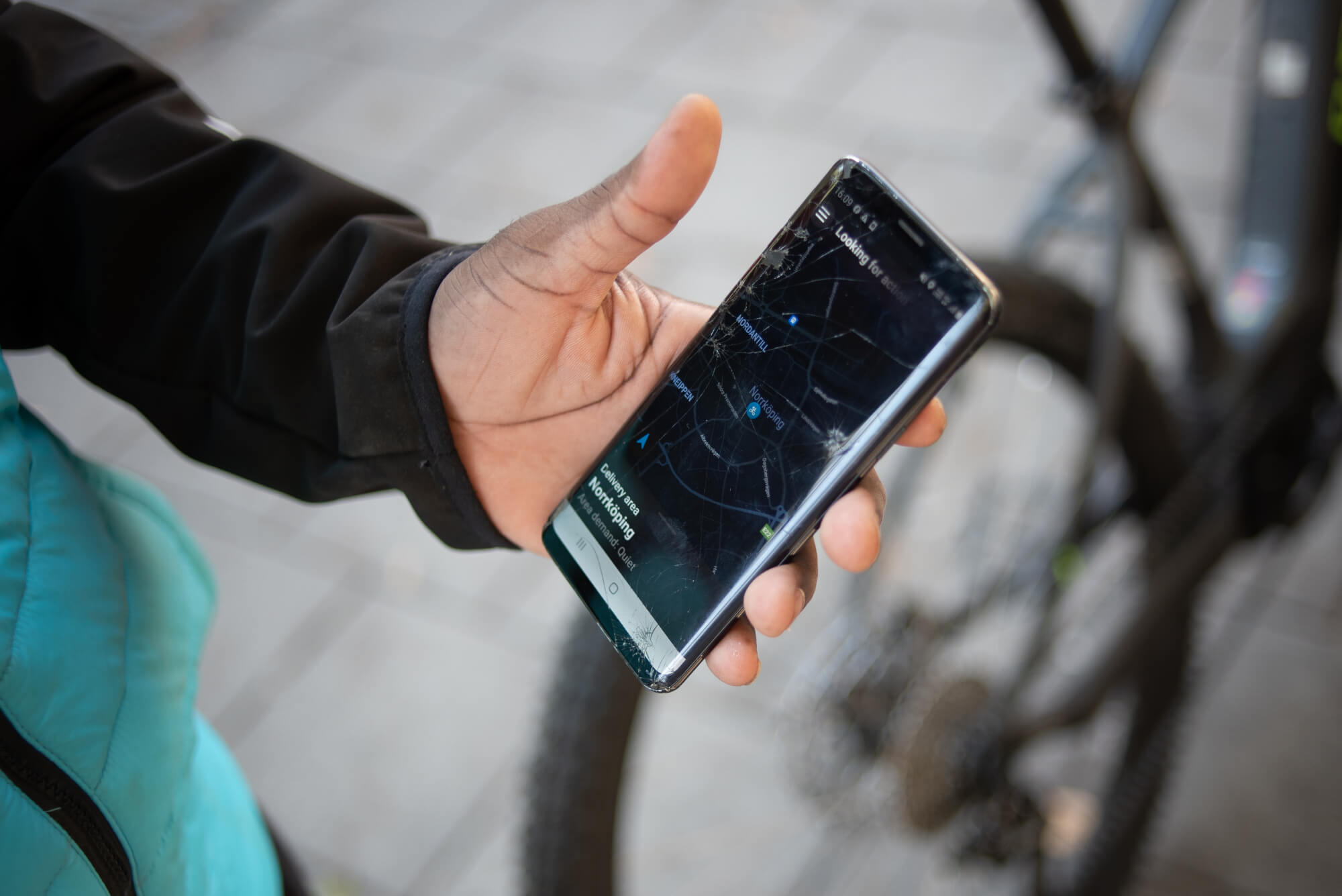 Because one time it was snowing, like it was too, too cold and the snow was a lot and I was on the bicycle. Eh, I’m gonna first tell you the good side of it, the positive customers, and I got five different pizzas, they went to a family. At Norr, no, no, no, Linköpingsvägen. And eh, the snow was almost like here it was really really really snowing and very cold and that night I didn’t have gloves with me, I, I’d lost my gloves. But I would just like ride my bicycle and put one hand in my, my jacket then, like, go on and ride my bike until this one is too cold and I, I’d change like this, you know [shows how he put one hand inside the sleeve of the jacket and the other one on the bicycles handlebar] because I used to put my phone on my, on my bicycle like this, so I could see the address [inaudible] to touch it.
