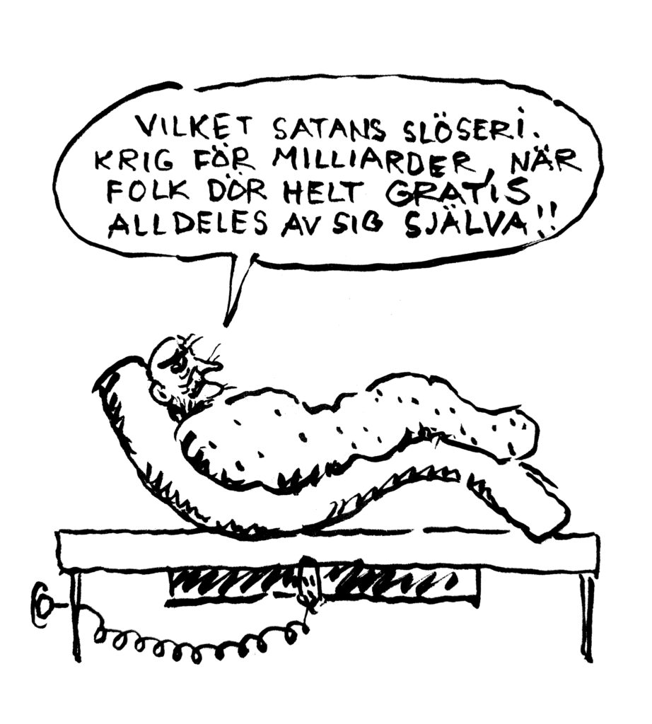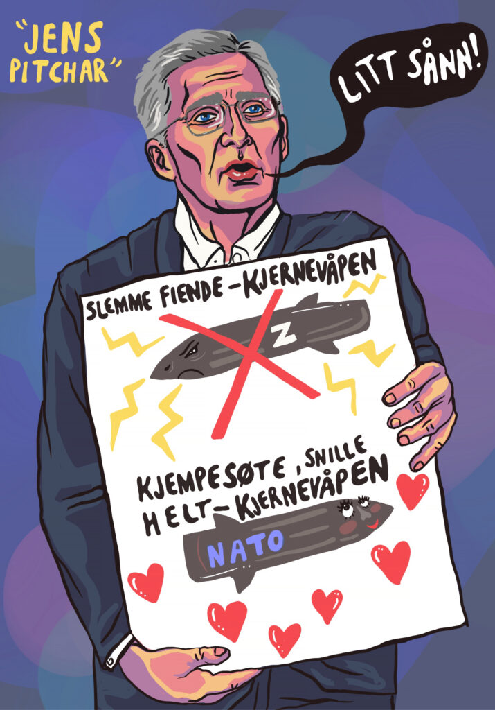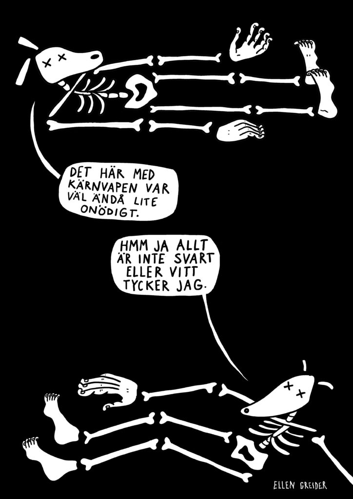I utställningen finns en stor bredd av svenska tecknare representerade, bland dem några av våra mest folkkära. Tillsammans ger de sina perspektiv på frågan om den svenska alliansfriheten, Nato och kärnvapen på svensk mark. Resultatet är ett oförglömligt samtidsdokument fullt av vanvördig humor och djupaste allvar.