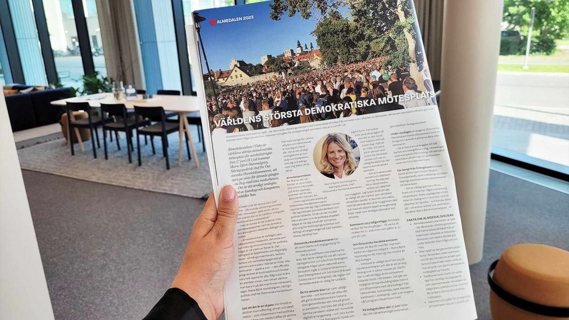 -Almedalsveckan är verkligen samhällsdebattens höjdpunkt, det enda som kan mäta sig intressemässigt för politiska frågor är väl valet var fjärde år. Det häftigaste är öppenheten och tillgängligheten, så många makthavare, beslutsfattare och samhällsengagerade på samma vackra plats i hjärtat av Visby. Alla seminarier – uppåt 4 000 – i det officiella programmet är kostnadsfria och brukar vara helt öppna för alla. Några kan kräva en anmälan innan, men oftast släntrar man bara in på det man finner intressant, säger Maria Björk Hummelgren, näringspolitisk chef för Östsvenska Handelskammaren.