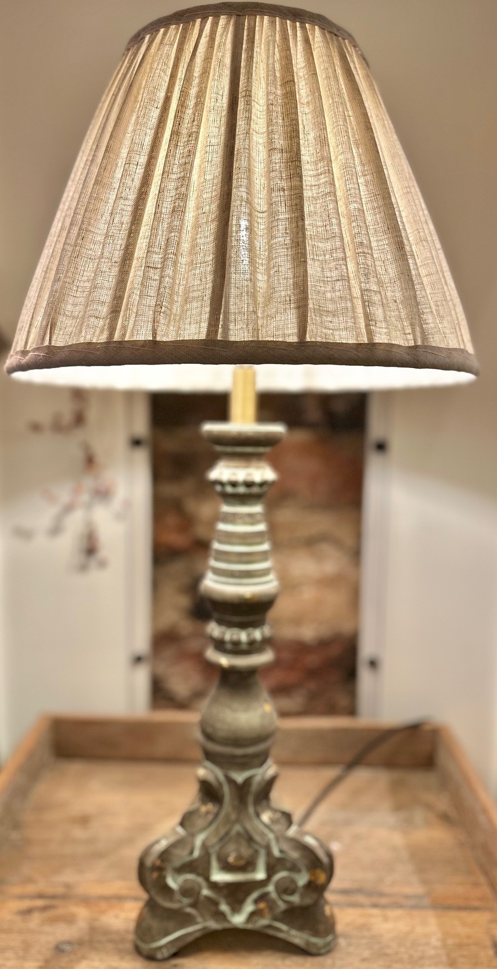 En klassisk lampfot i trä i vacker grön/grå färg med snirkliga detaljer i ”smutsguldig” färg, en tidlös lampfot som på bilden visas med en veckad linneskärm. För annat förslag kontakta oss på info@butikesq.se