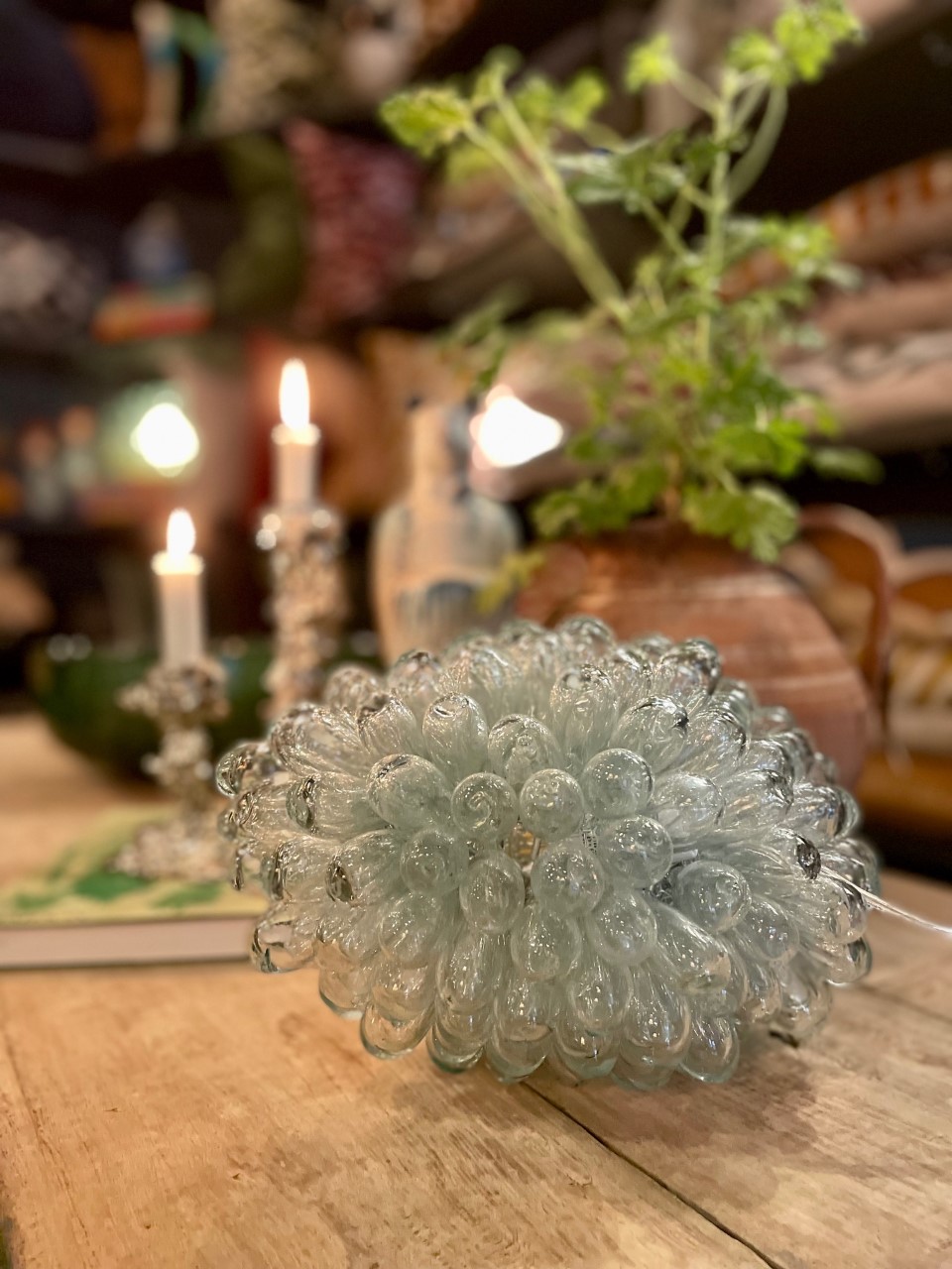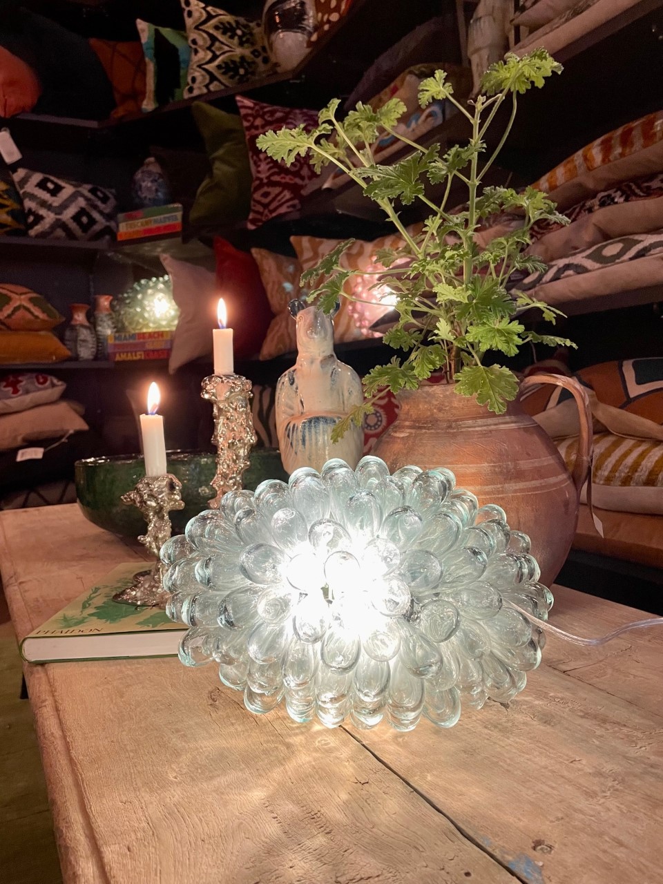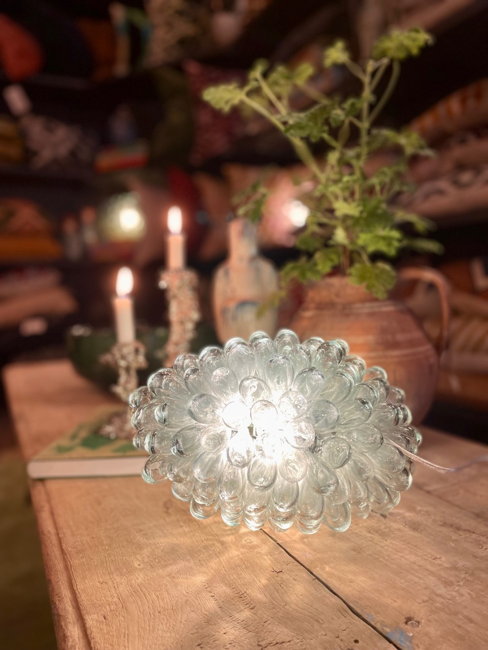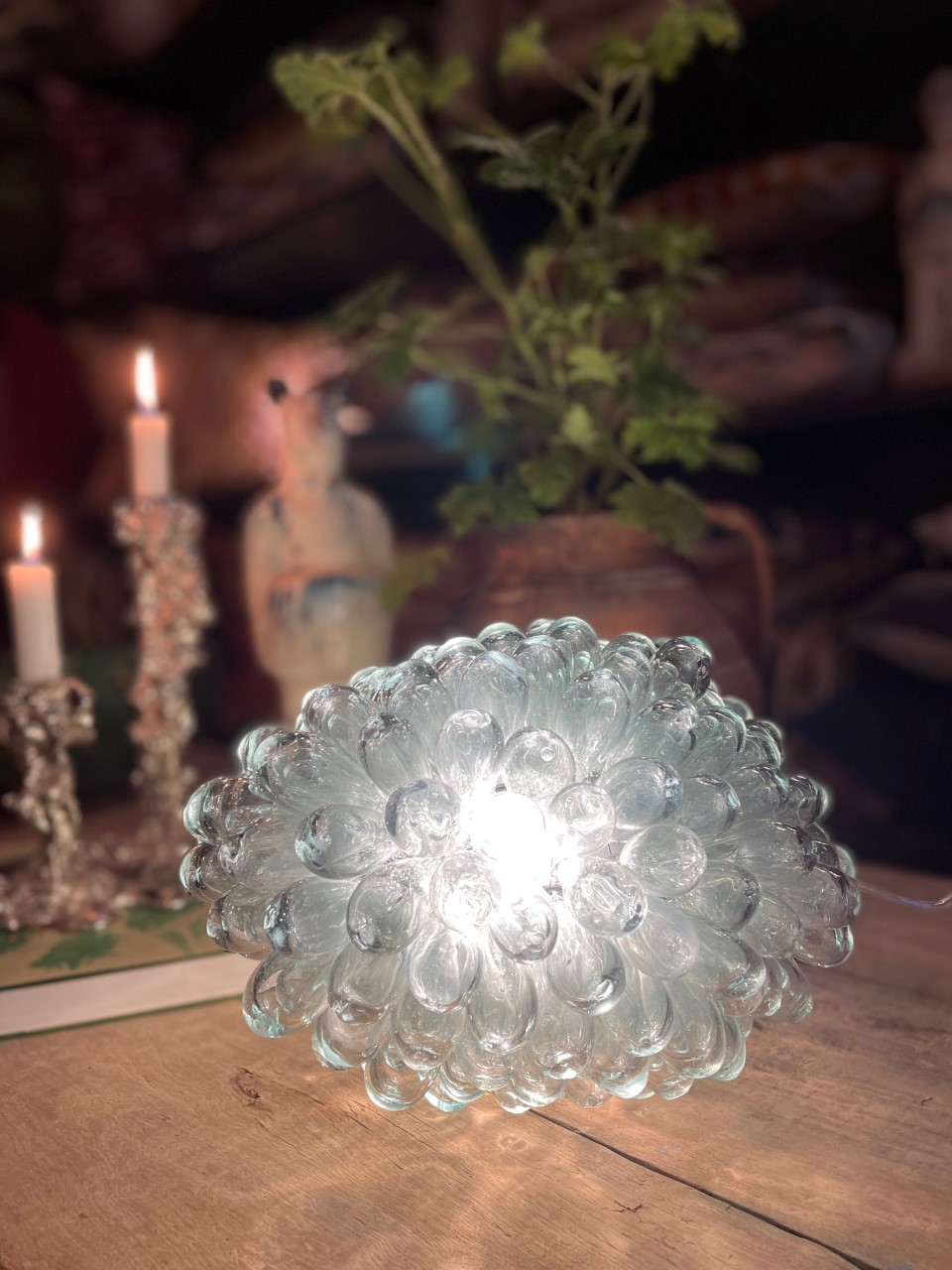 Blåst glas har sitt ursprung i det första århundradet långt före vår tid. Detta vackra kluster som är formad som en druva är handgjort i Syrien av glasblåsare som känner till den riktiga traditionen för glasblåsningsteknik. Glasblåsare är trollkarlar. Som alkemister, gömda i sina verkstäder, övar de konsten att omvandla smält glas till enorma dekorativa föremål. Mäster-glastillverkaren själv blåser in luft i det smälta glaset och kontrollerar och formar det så att det kan blomstra i ett glaskluster och ut kommer vackra munblåsta och handgjorda dekorativa föremål.