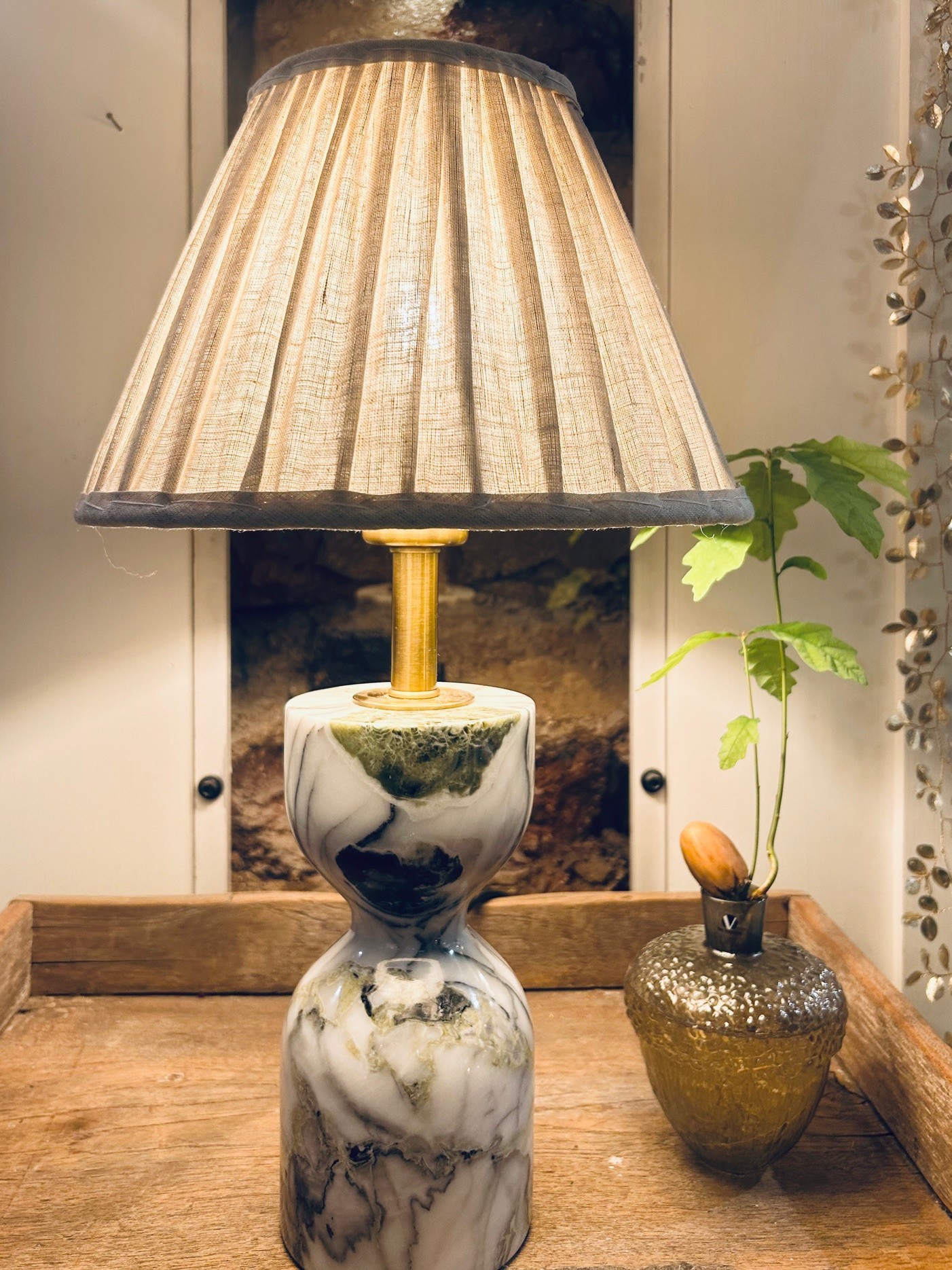 Stilren bordslampa i grön/grå marmor. Eftersom marmor är ett naturmaterial ser ingen lika ut och kan därmed skilja sig från den på bilden.