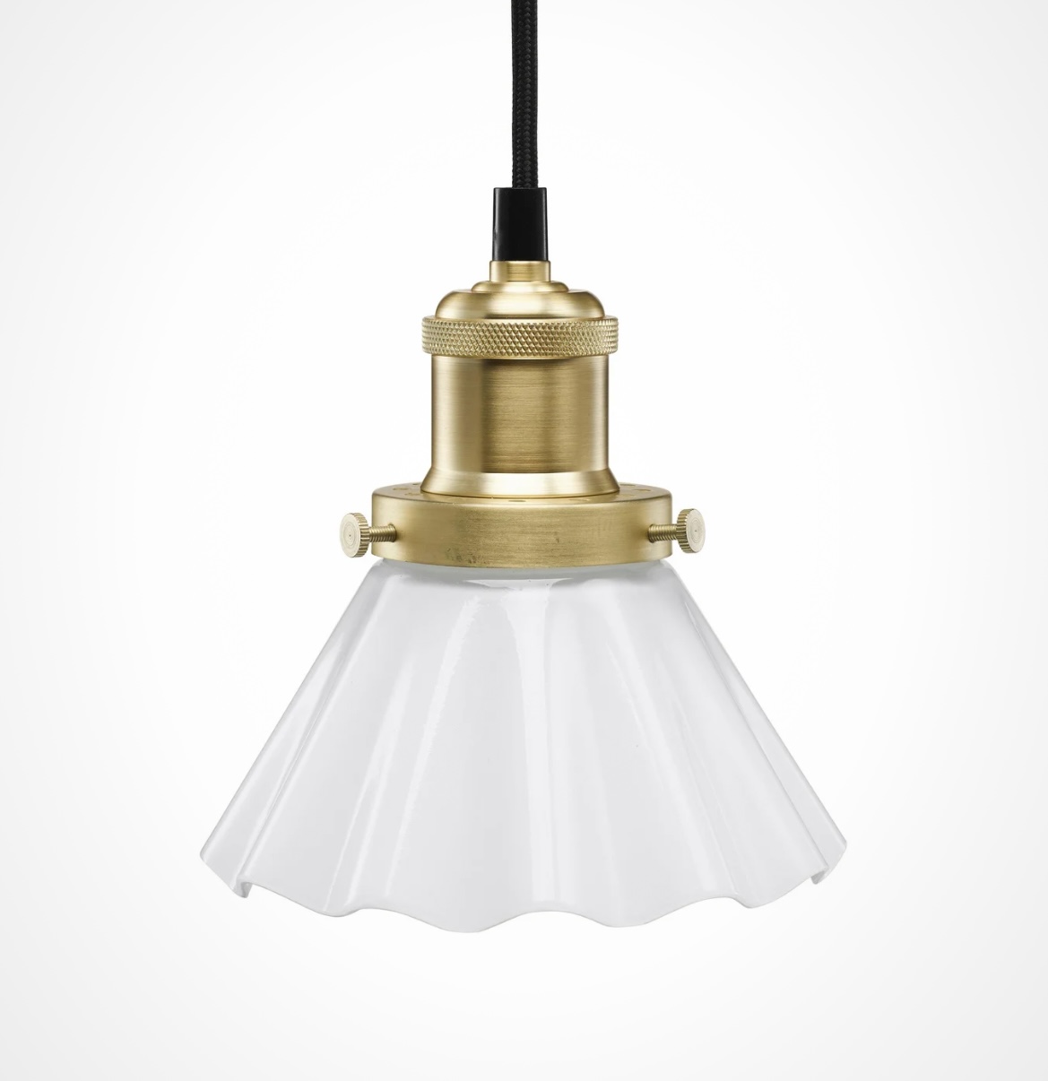August skomakarlampa i klassisk stil. Veckad lampskärm i opalfärgat glas och lamphållare i metall med borstad mässingsfärg. Denna nätta lampa passar bra i grunda fönster men även över köksbänken. Lampan kommer med en svart textilkabel som är 3 meter lång och har väggkontakt och strömbrytare.