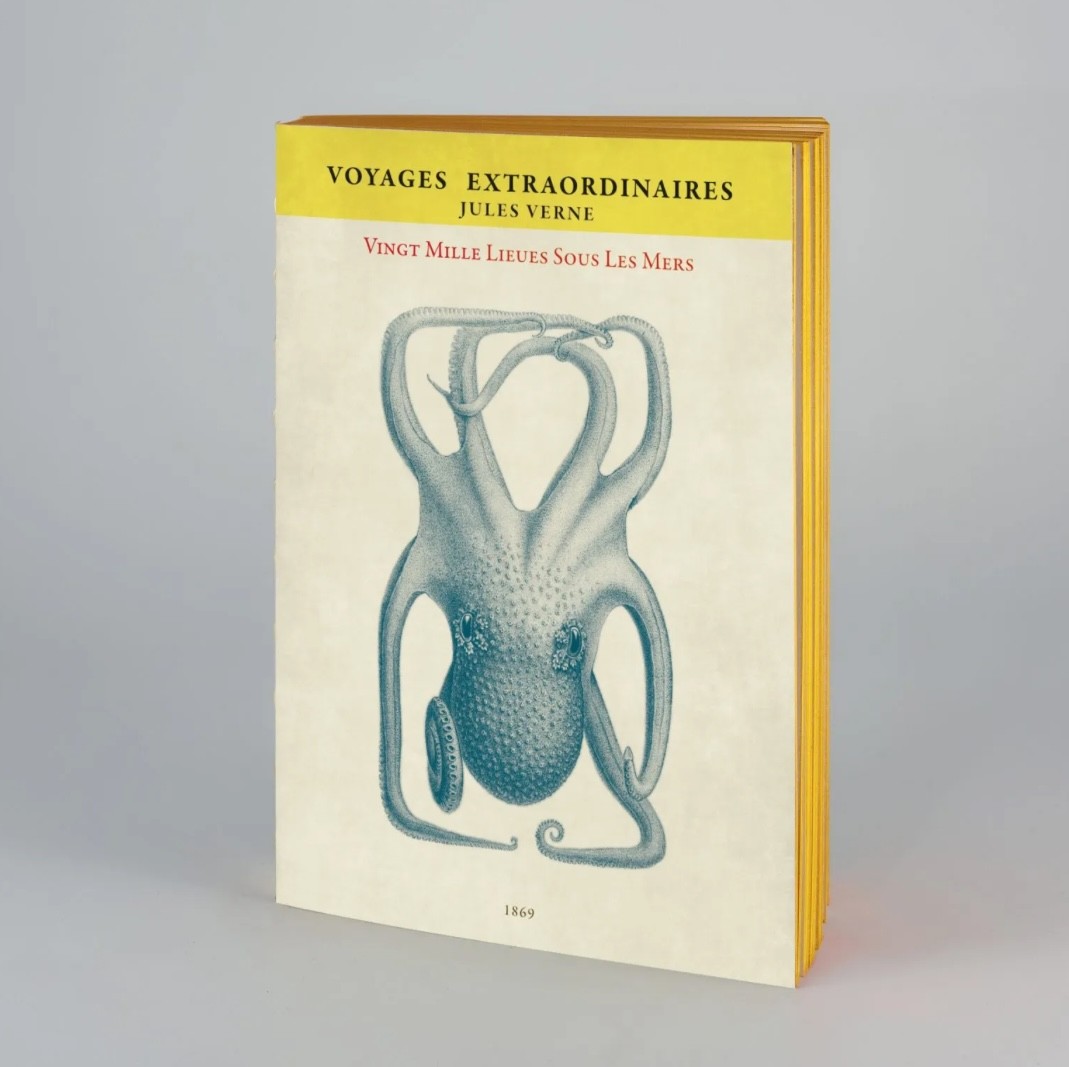 Omslag: 20000 Lieues sous les mers – handfärgad skiva i gult.