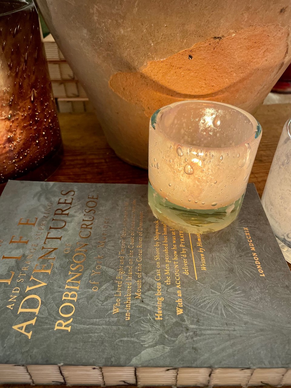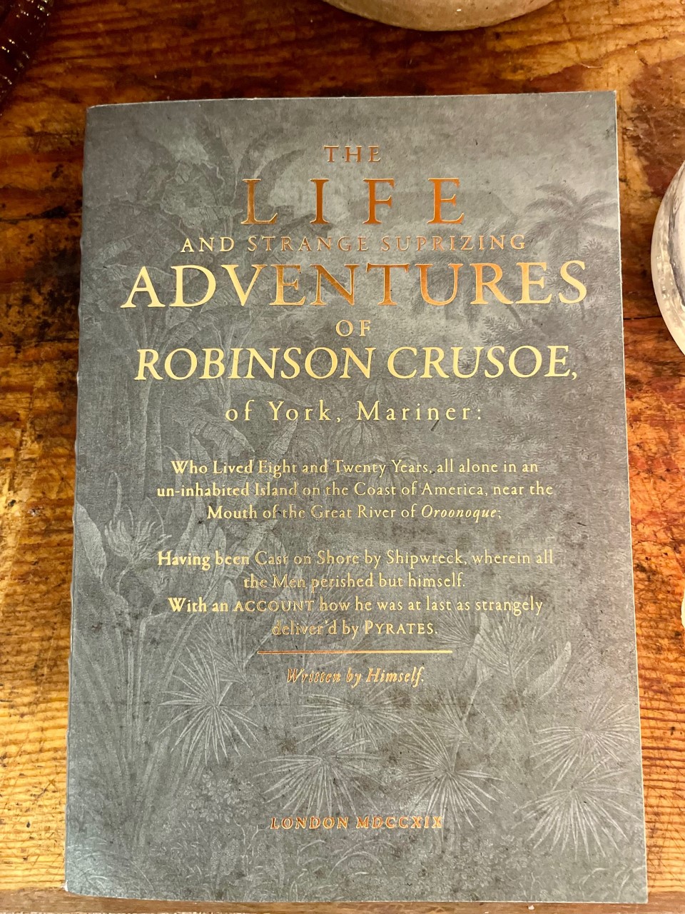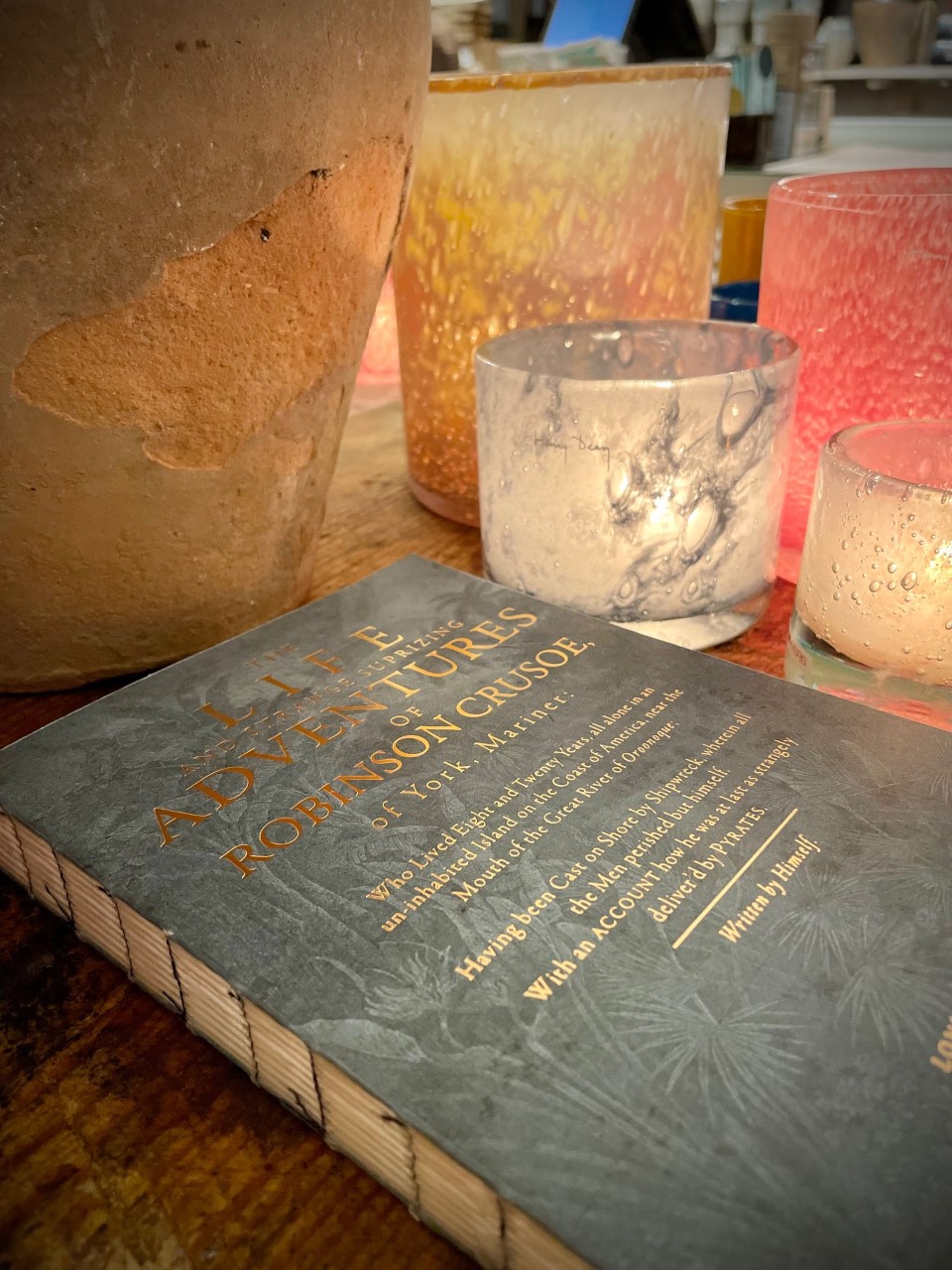 Omslag: Omslag: Robinson Cruse – handfärgad skiva i blått.