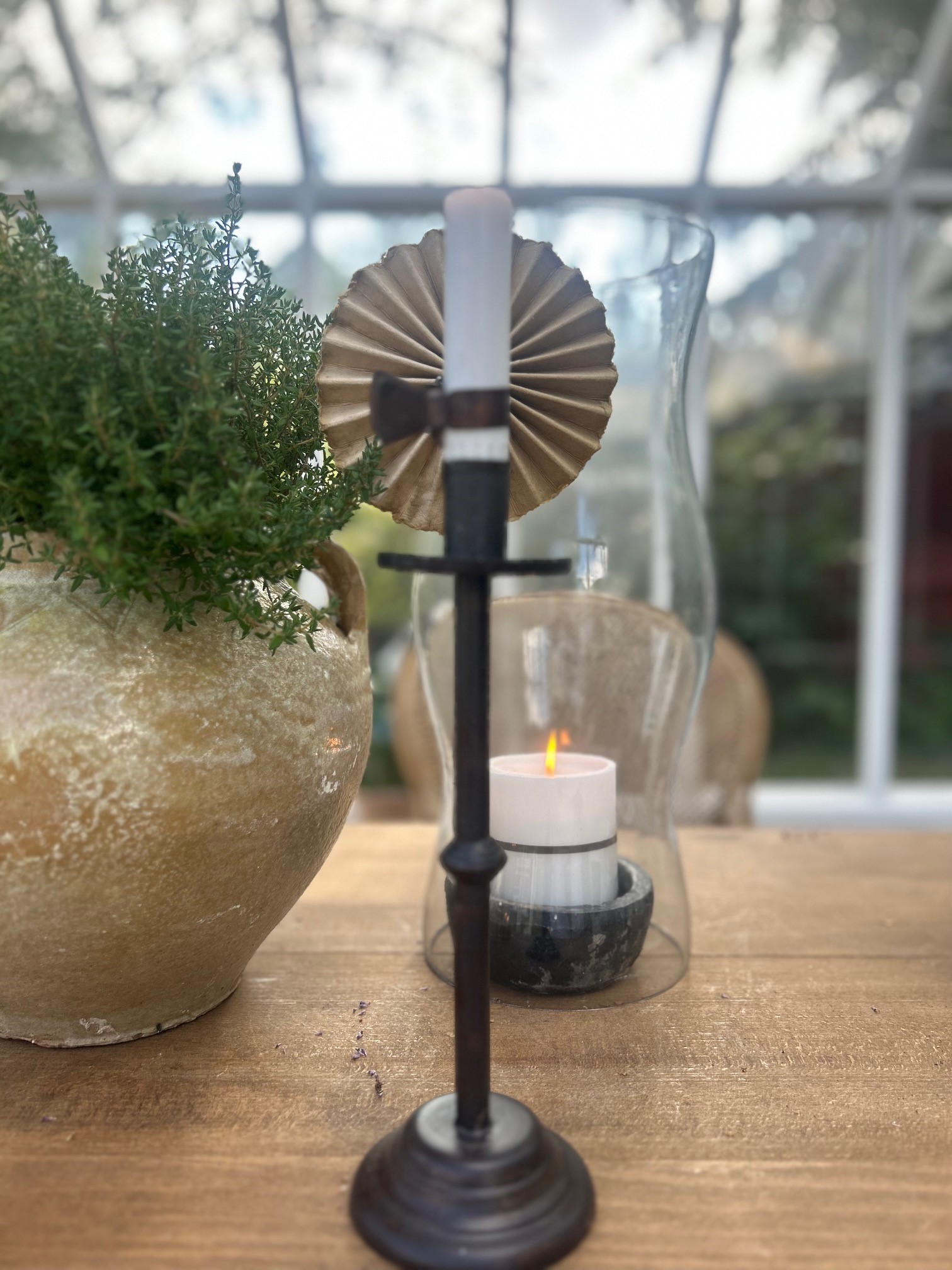 Flabellum är en fantastisk detalj och dekoration till din ljusstake, som en solfjäder i kraftigt handvikt papper som kläms ihop med en klämma som sen kläms fast runt ljuset/ljusstaken och blir en effektfull detalt och skapar en fin skugga mot väggen. Klämman är så pass lång att bra avstånd hålls till pappret men självklart ska aldrig levande ljus lämnas utan uppsikt.