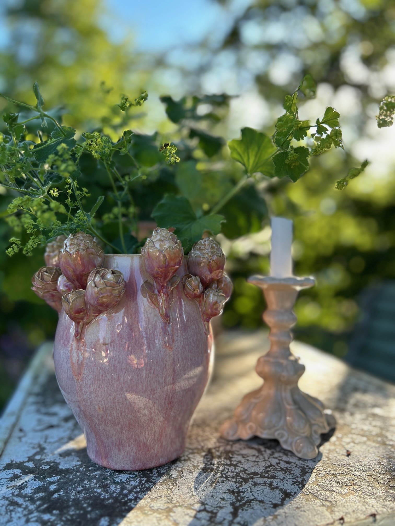 En vacker keramikvas med dekorativa rosor runt öppningen i en smutsrosa färg med skiftningar i sand. Varje exemplar är unik så ingen ser exakt lika ut.