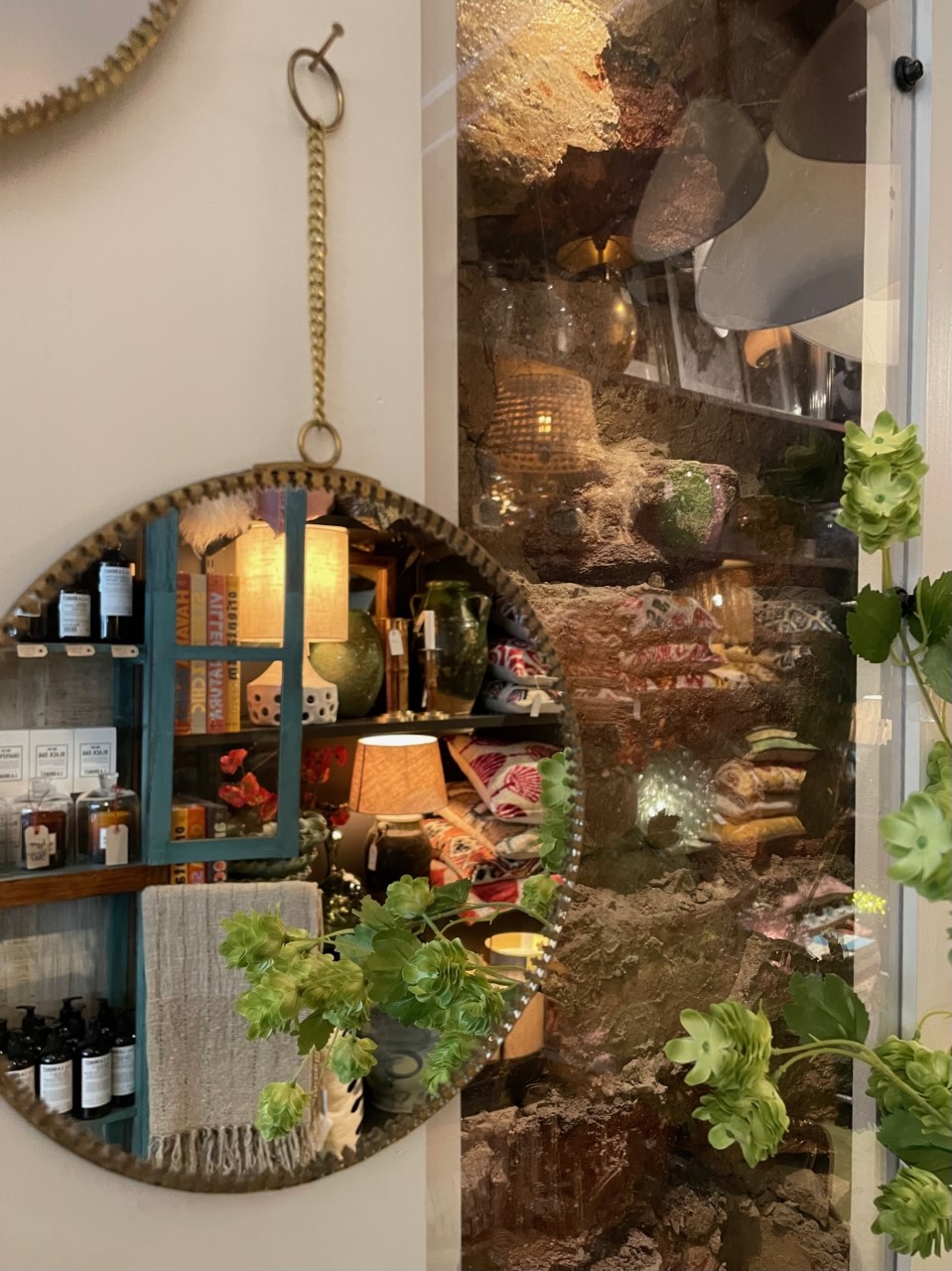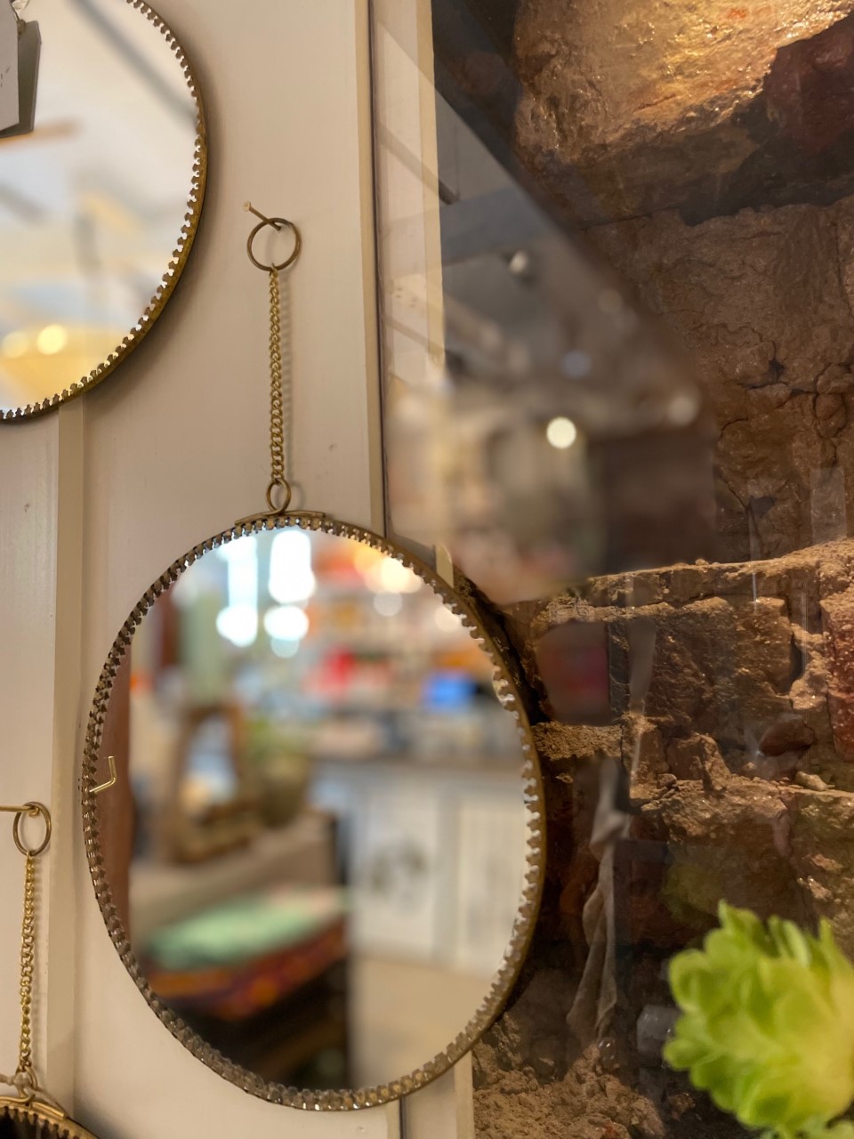 Nätt spegel, som ett smycke på väggen, blir denna runda spegel med en tunn dekorativ mässing kant. Spegeln hängs upp med kedjan som sitter fast i spegeln.