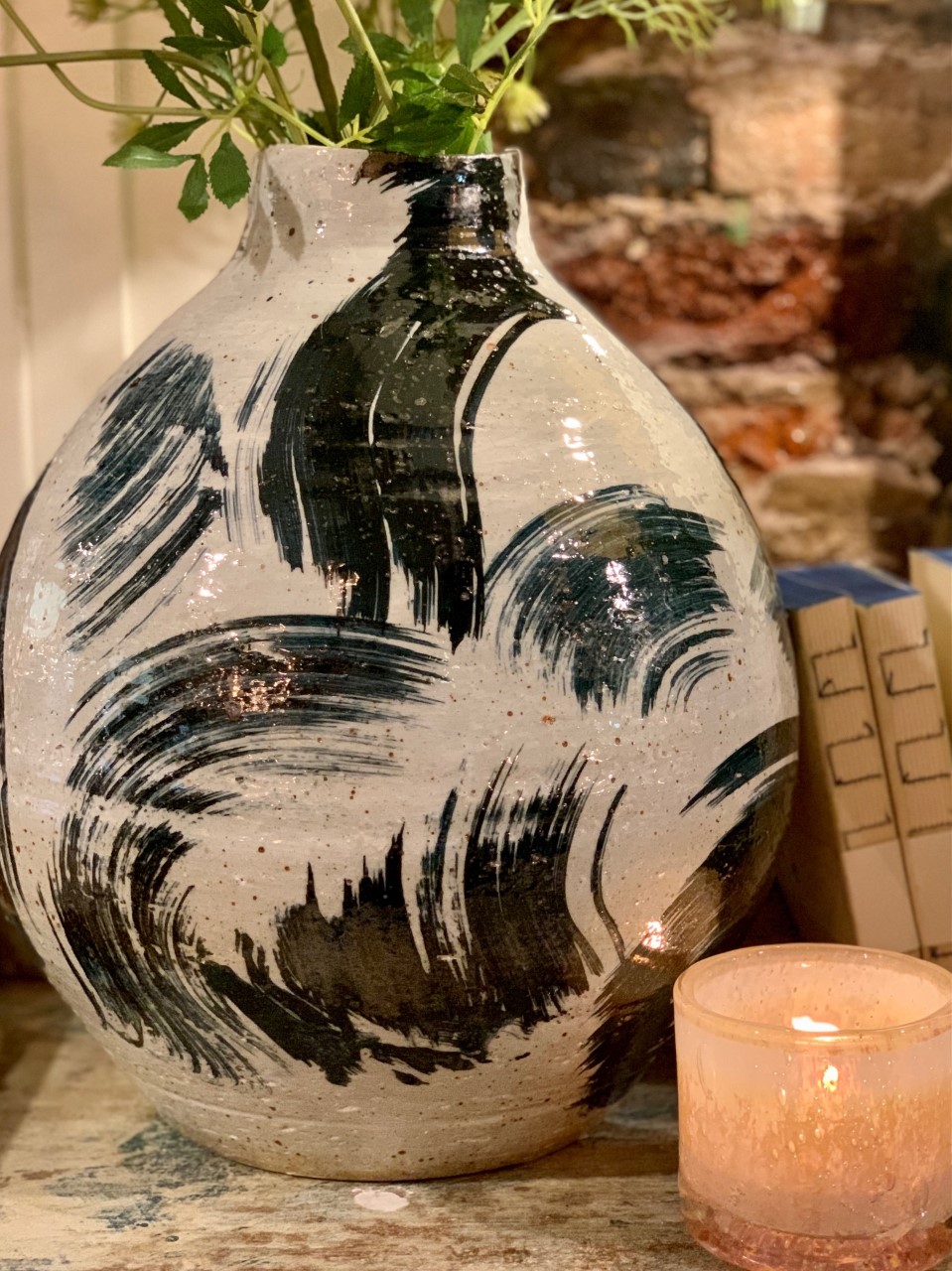 Handgjord stor glaserad keramikvas som är vacker som den är men väldigt dekorativ med ett fåtal kvistar i.