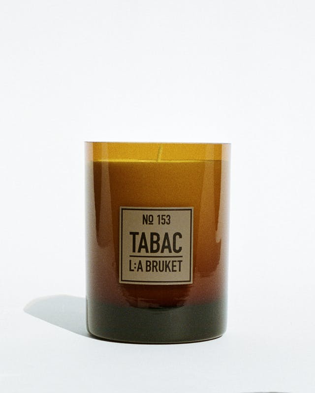 Doftljus gjort av vax från ekologisk soja med en doft av Tabac. Doftljusvaxet fylls för hand i ett munblåst bärnstensfärgat glas. Ljuset har en brinntid på mer än 45 timmar.