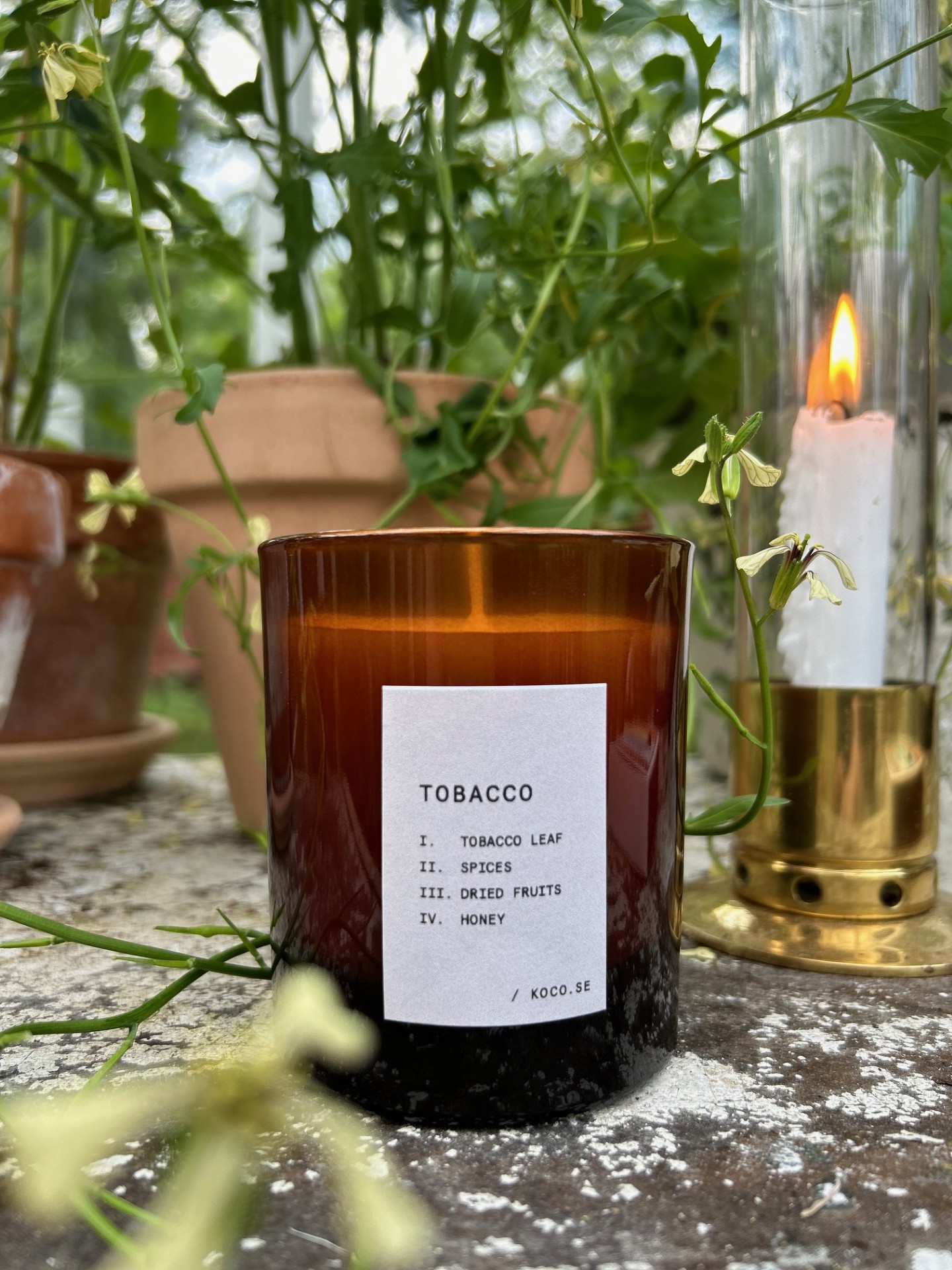 Svensktillverkade doftljuset Koco Tobacco sprider en varm och harmonisk doft från tobaksblad, kryddor, torkad frukt och honung. Varje ljus som är skapat med omsorg i små omgångar säkerställer en konsekvent och långvarig doft.