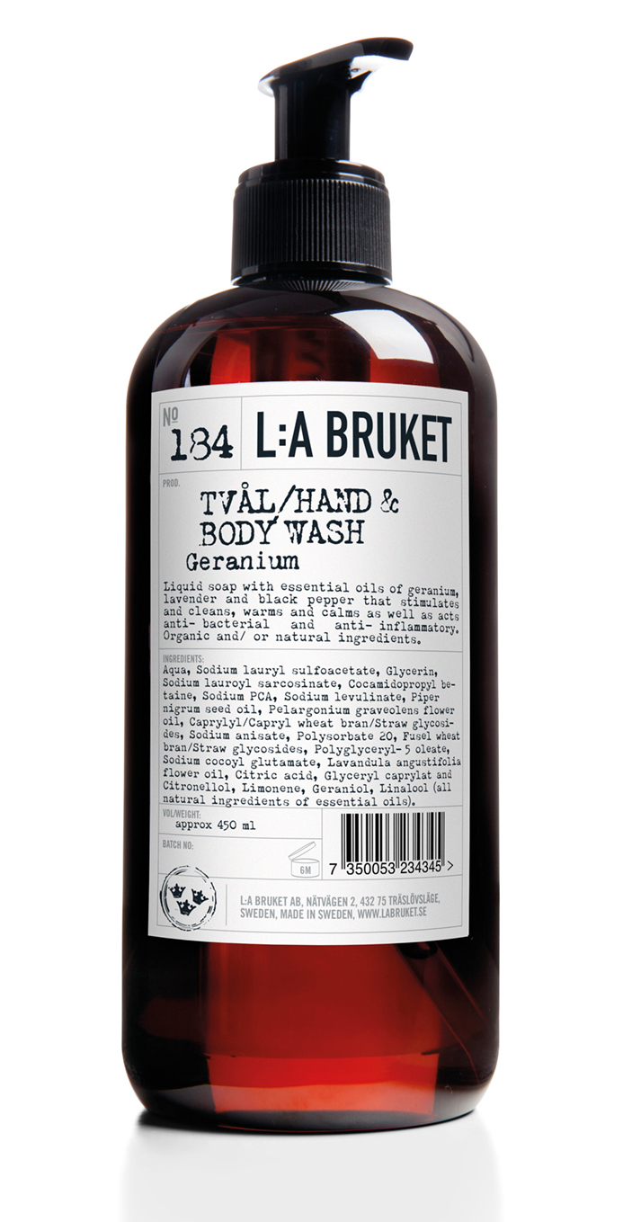 Flytande tvål Geranium som är en återfuktande hand- och kroppstvål innehållande eteriska oljor av sammandragande geranium, lugnande lavendel och värmande svartpeppar. Tvålen stimulerar, rengör och lugnar samt verkar antibakteriellt och antiinflammatoriskt på huden.