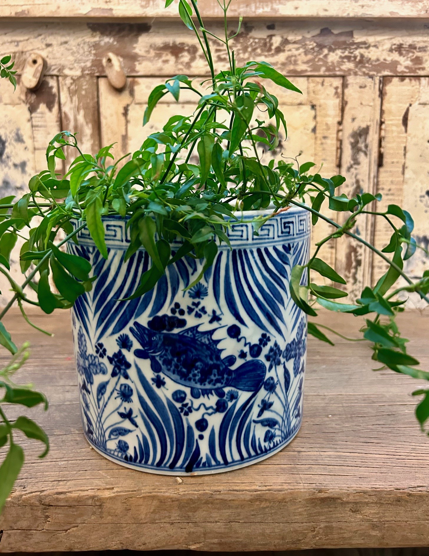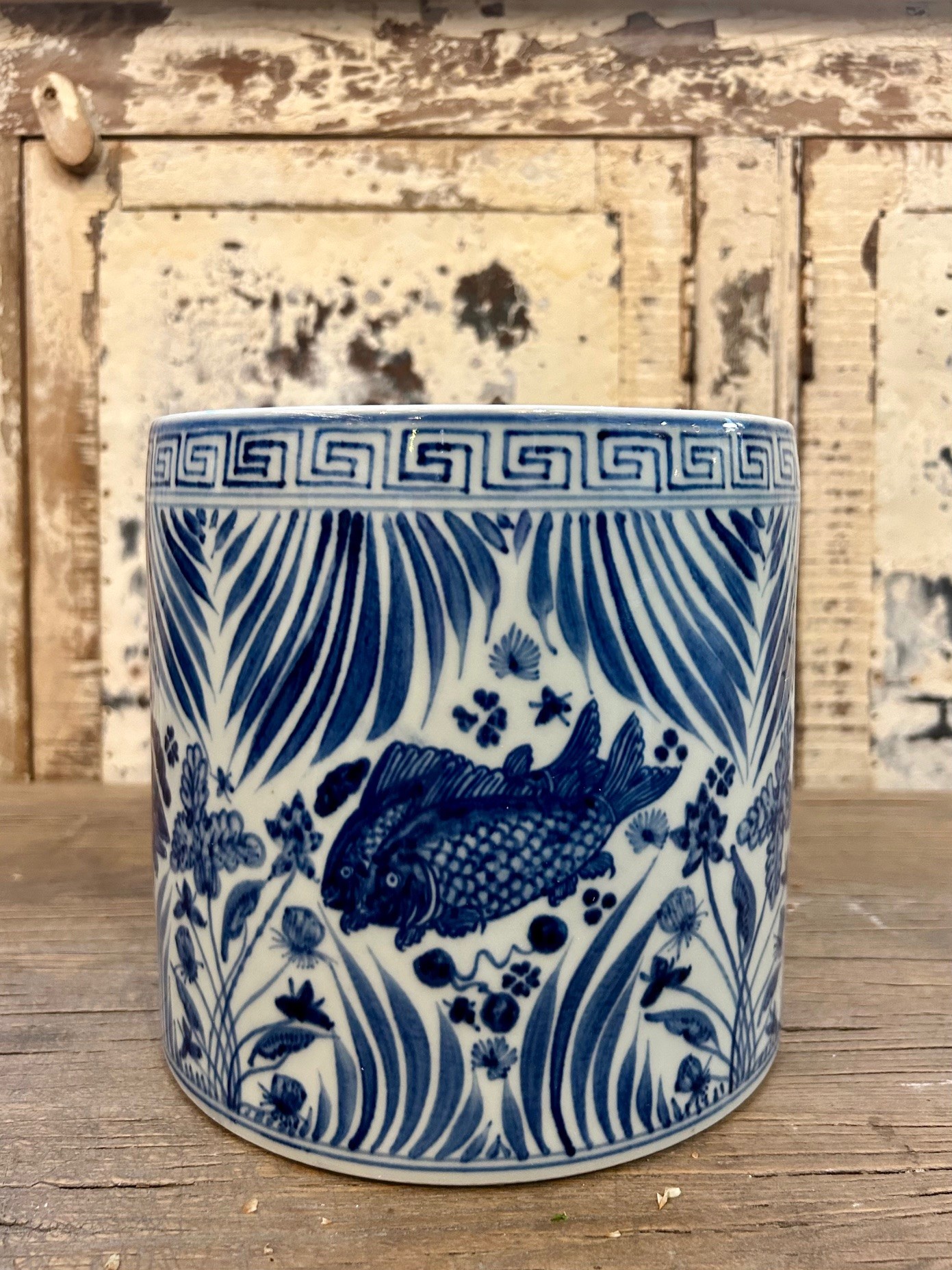 Den här krukan är dekorerad med Koi fiskar, växter och blommor i blått och vitt.