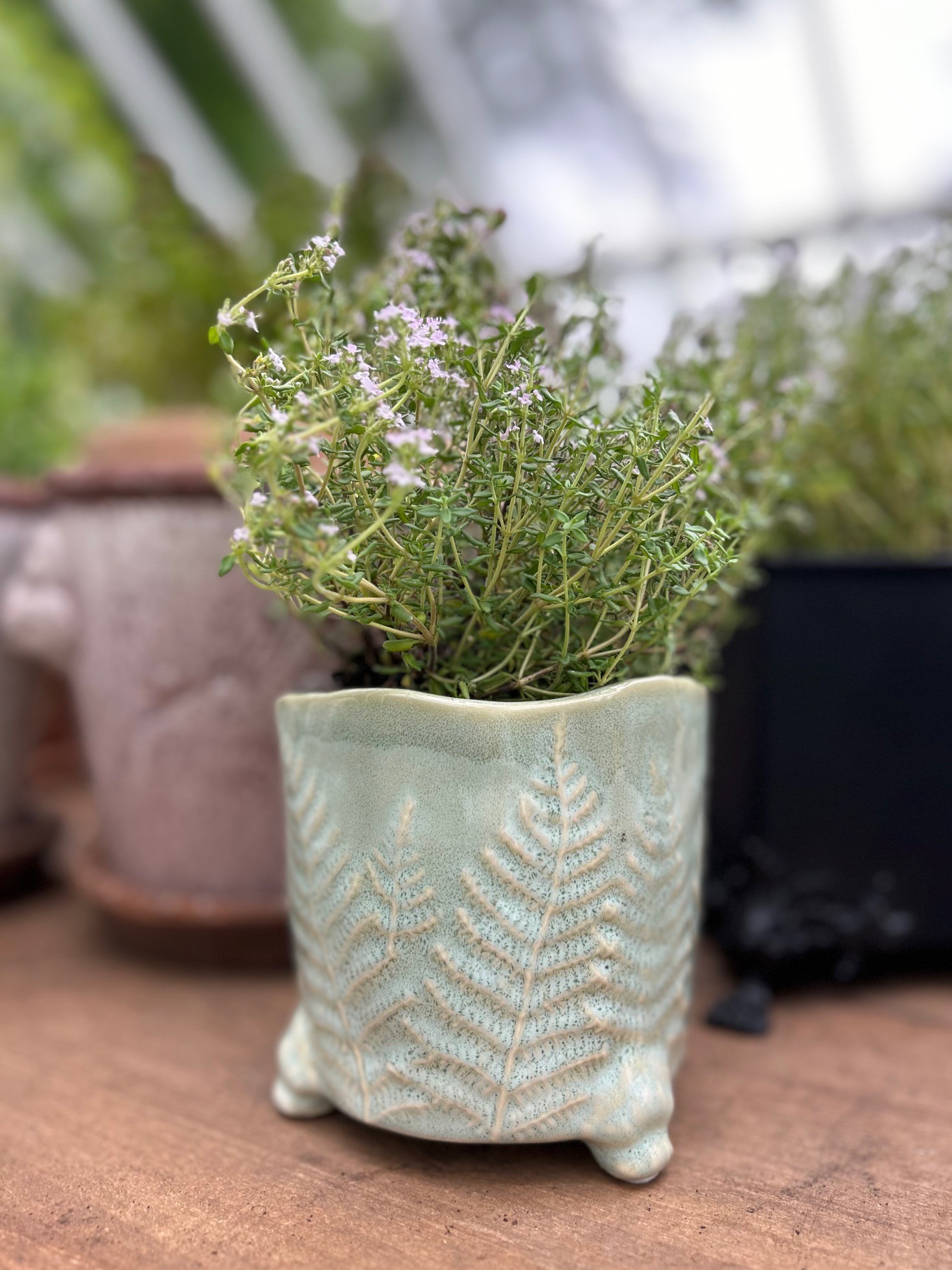 Söt kruka i svagt mintgrönt med ormbunksblad. Krukan har tre tassar vilket ger en extra dimension.