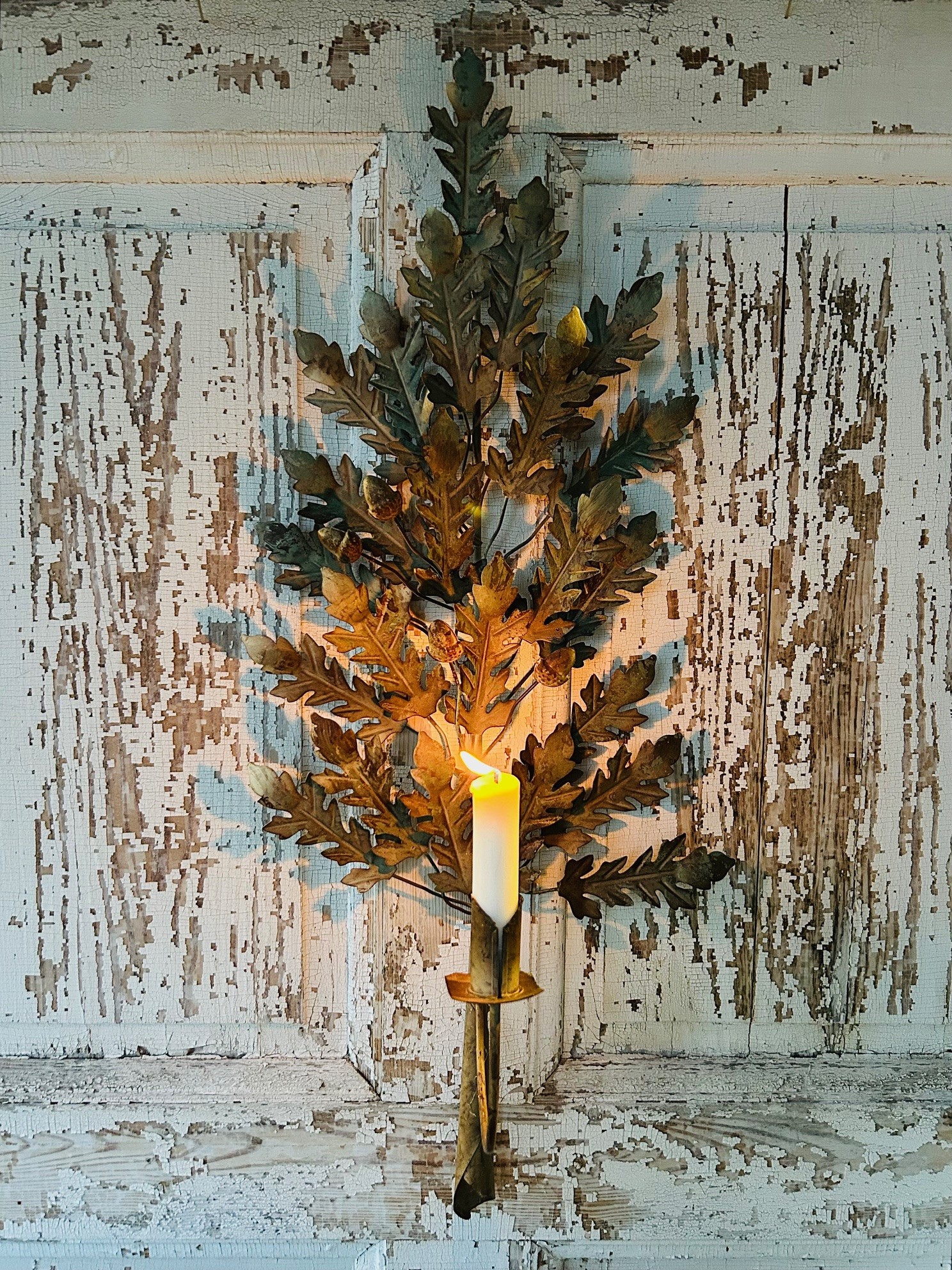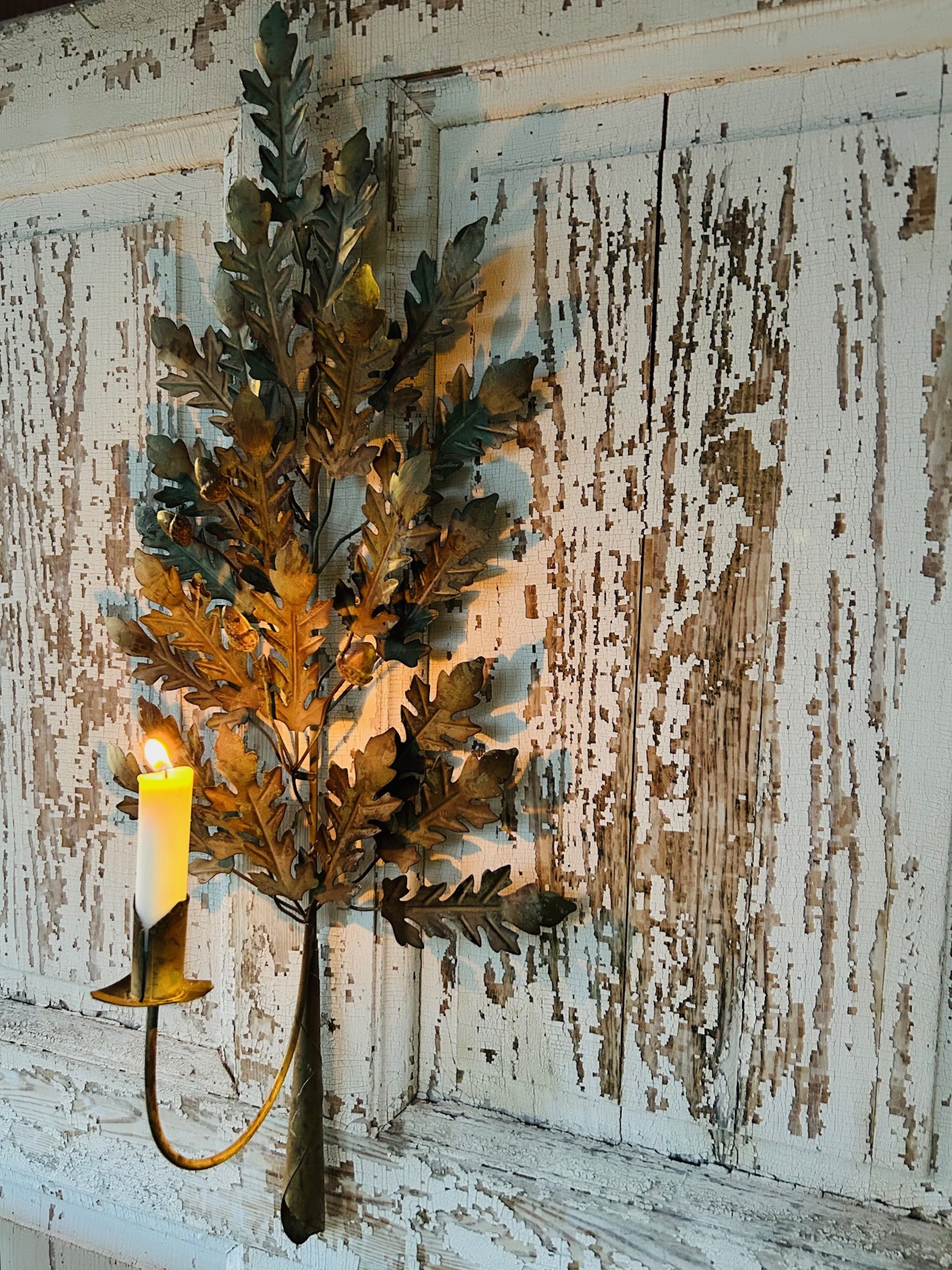 Historien bakom den här ljuslampetten att hänga på väggen är ett fragment av en metall hamrad ekgren som hittats på en gammal vind, förvandlad i sin form och patina. Hur som helst så väldigt vacker och dekorativ.
