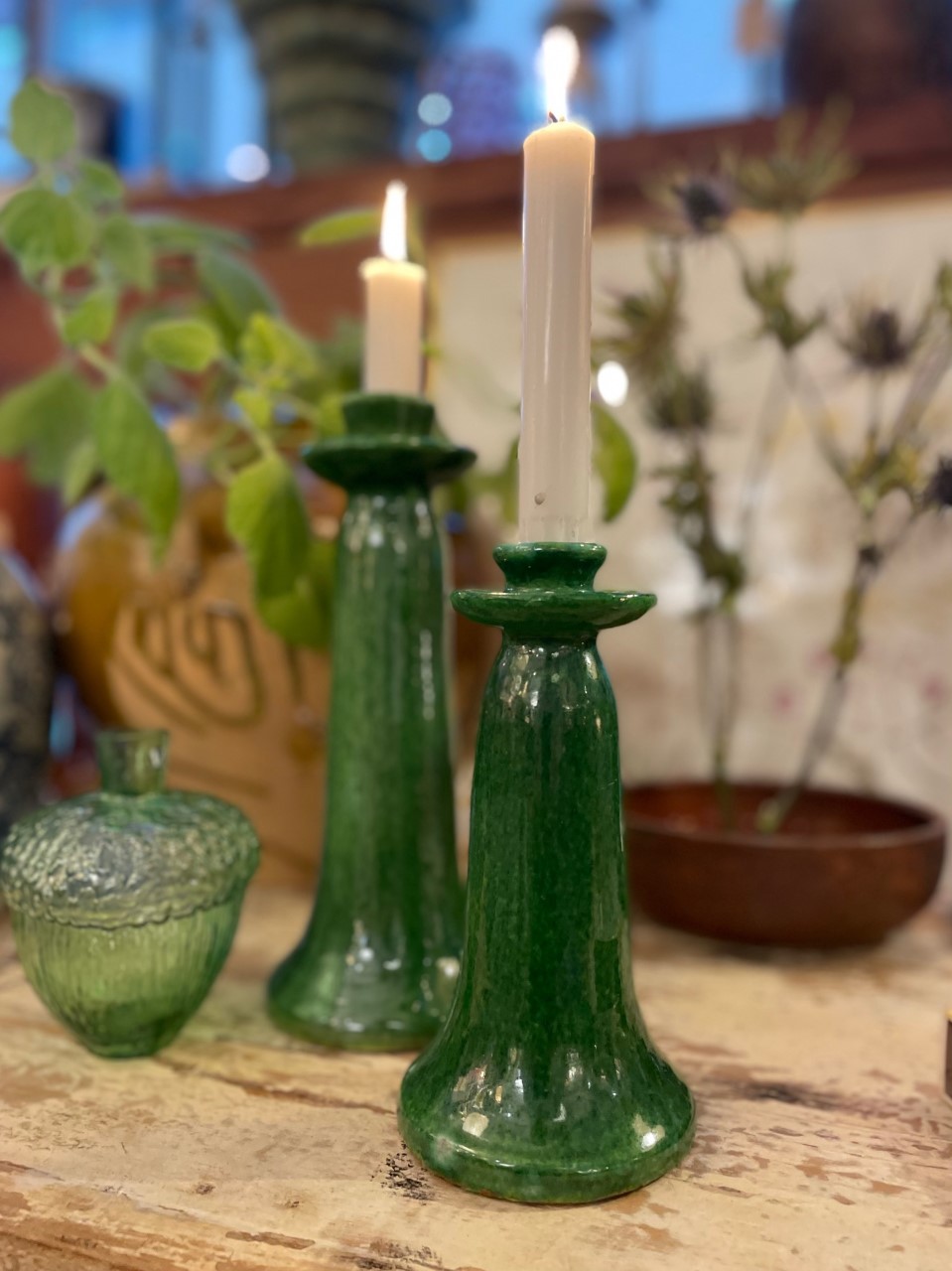 Keramikljusstakar i vaker grön färg, fina året om, som finns i två olika storlekar.