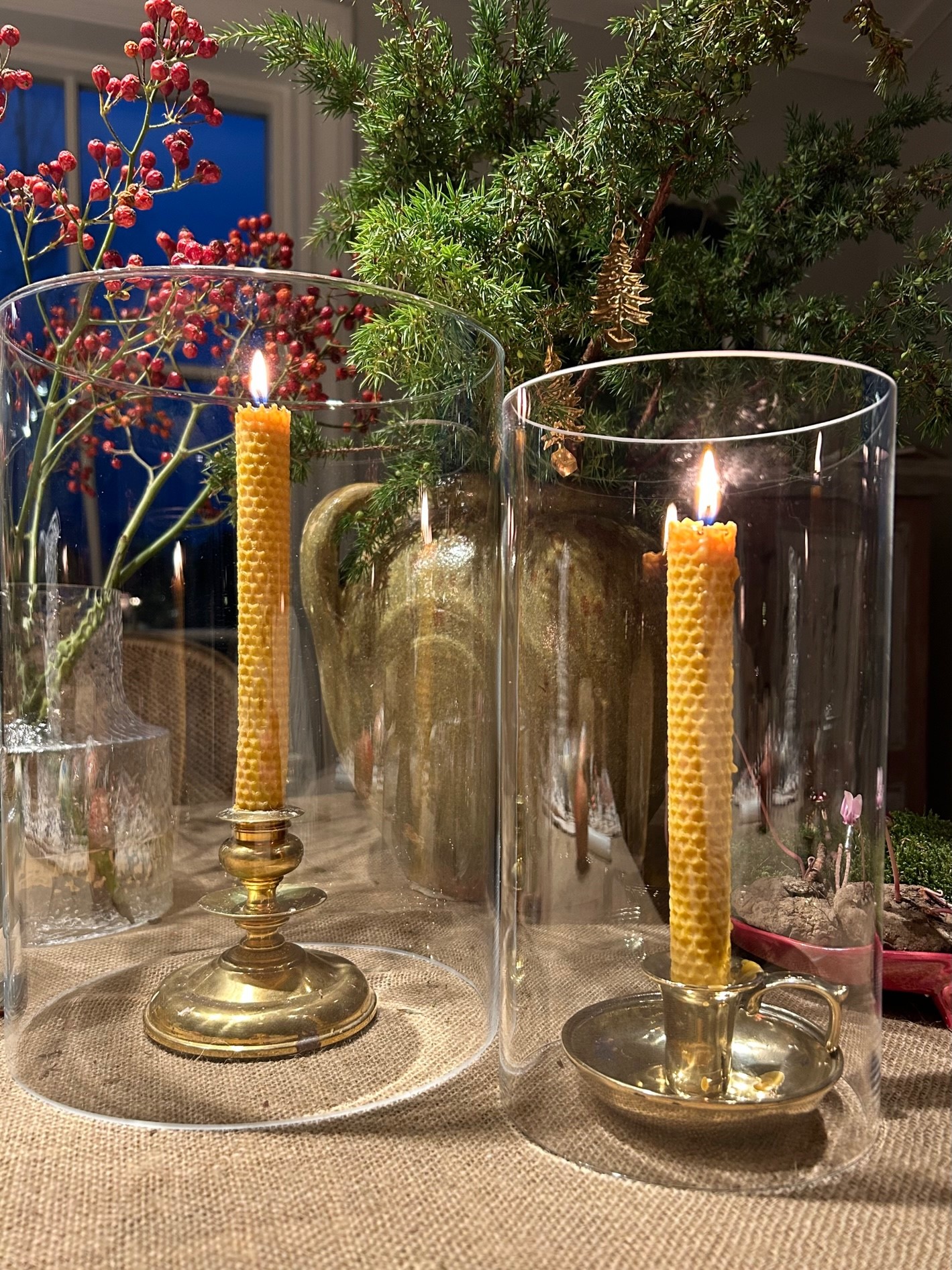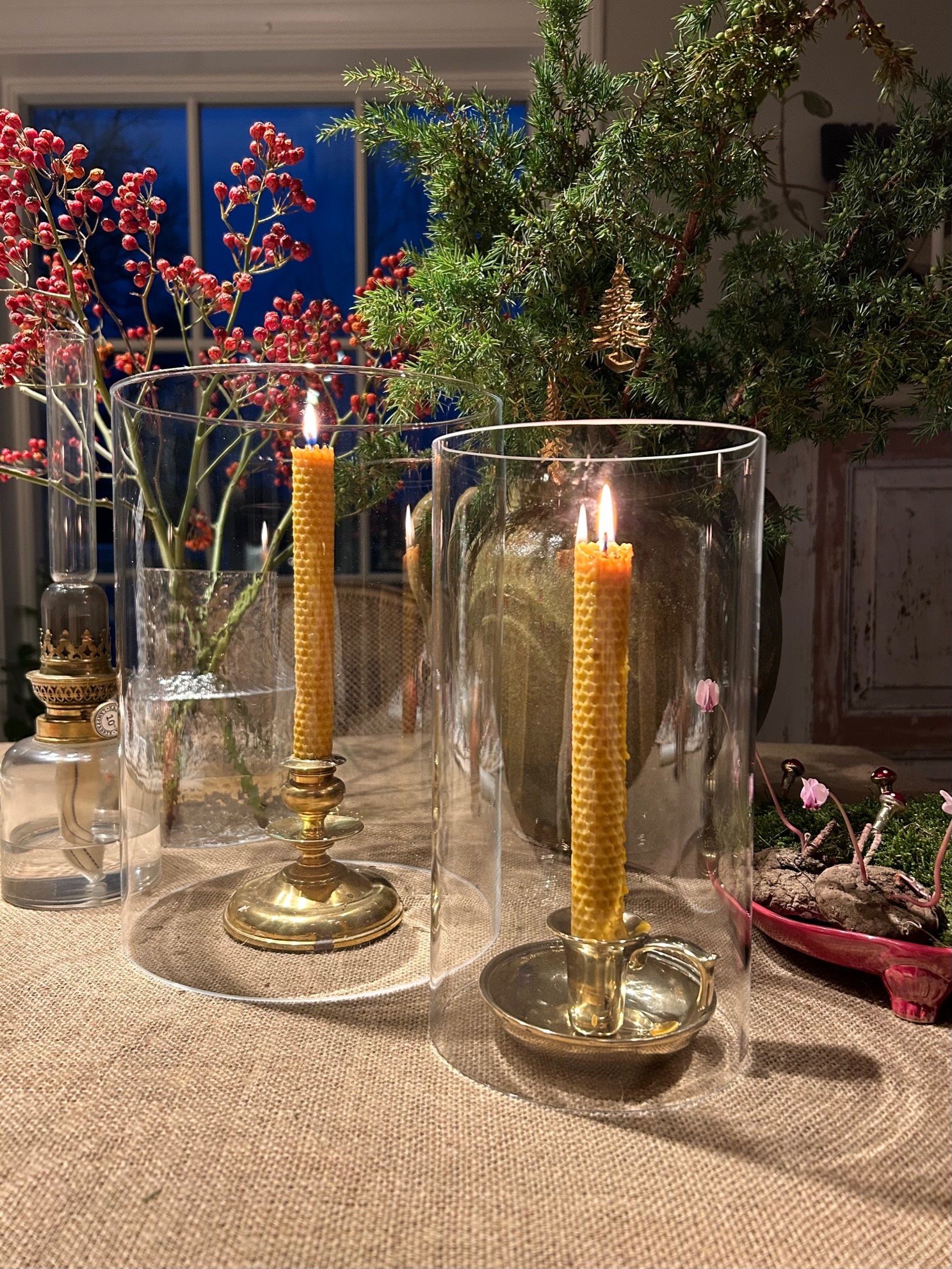 Hurricane glas är väldigt vackert och praktiskt att placera runt en ljusstake för att skydda lågan från drag. På bilden syns ljushållare Chapman och Italien German Champerstick.