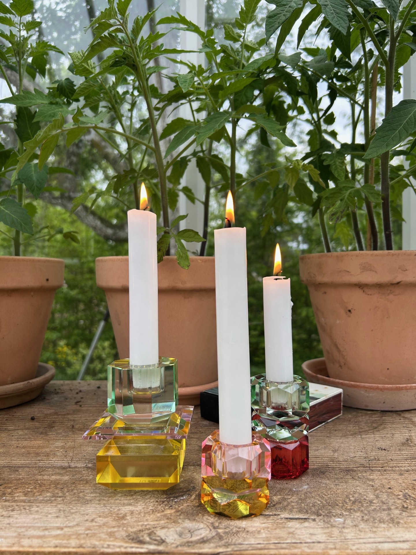 Ljusstake i genomfärgat glas i milda pastelliga färger, jättefin att blanda med de andra modellerna i serien, men förstås vacker helt ensam också. Vanliga kronljus passar till ljusstaken.