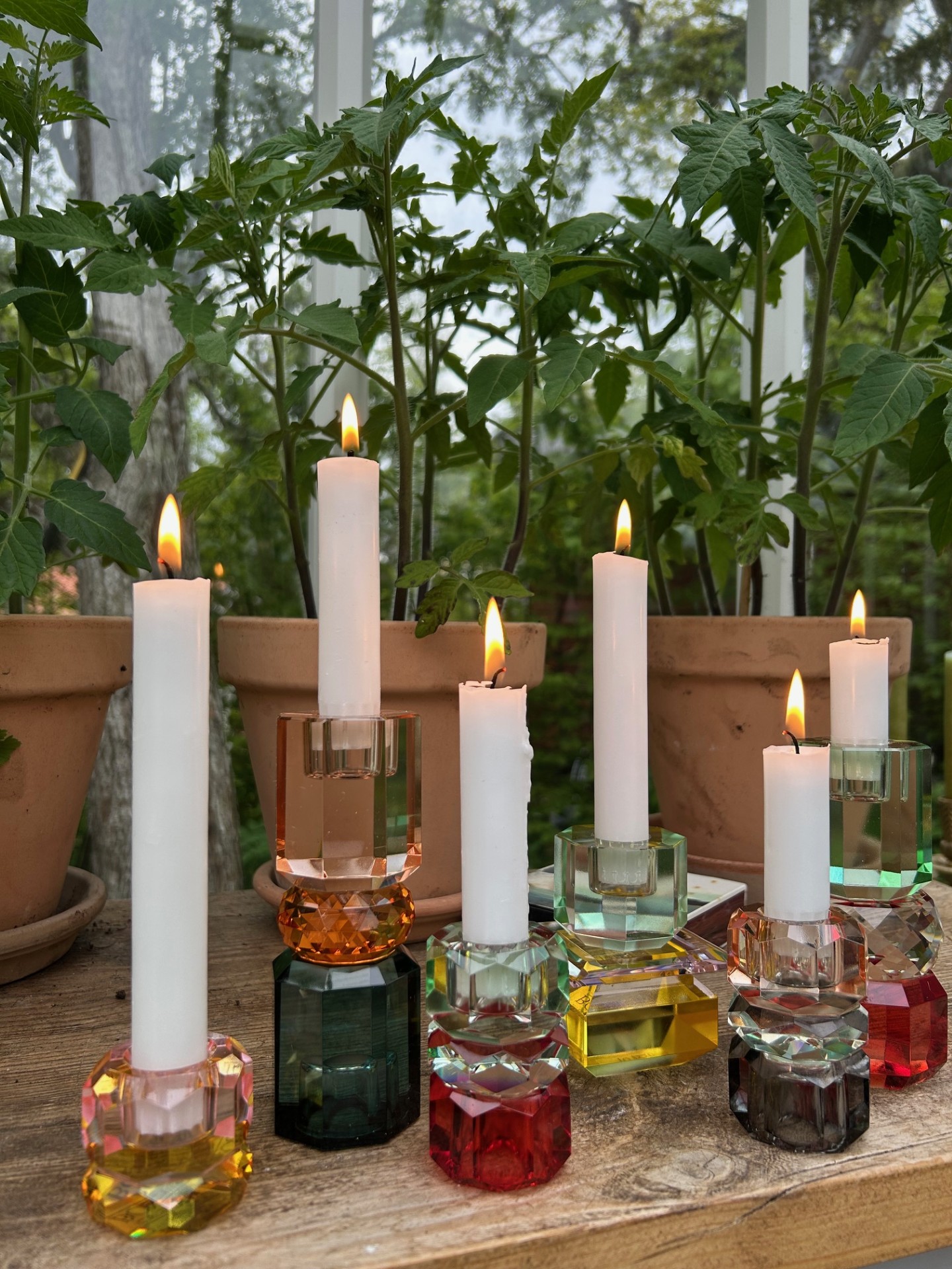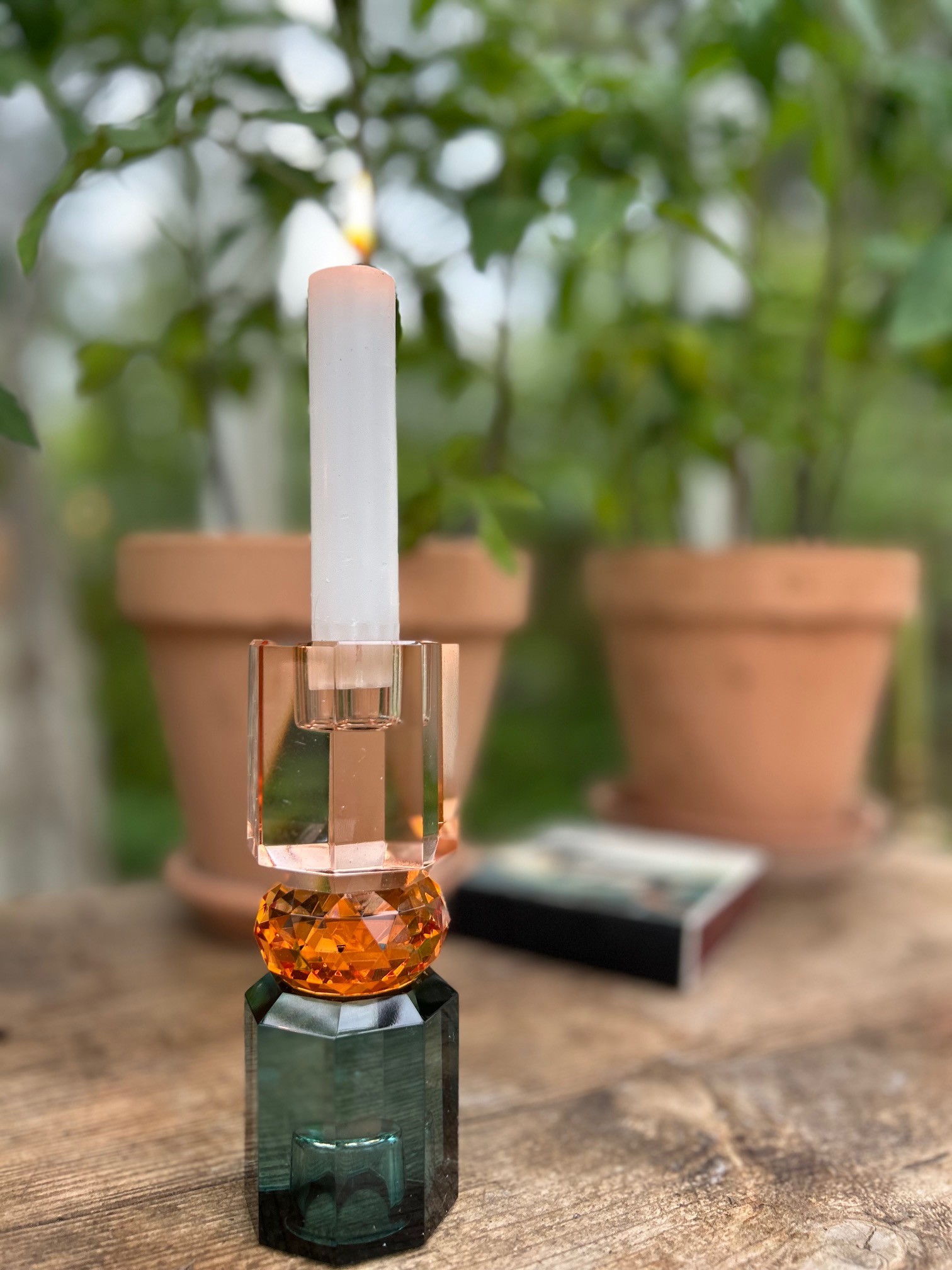 Ljusstake i genomfärgat glas i fin färgkombination, jättefin att blanda med de andra modellerna i serien, men förstås vacker helt ensam också. Vanliga kronljus passar till ljusstaken.