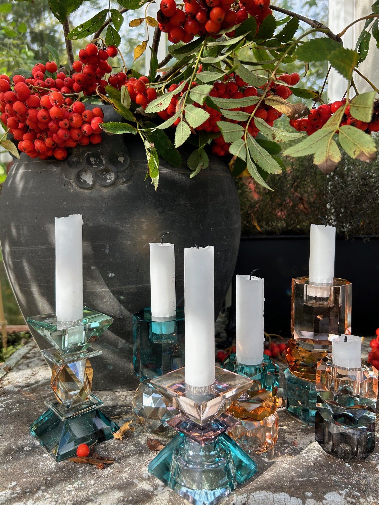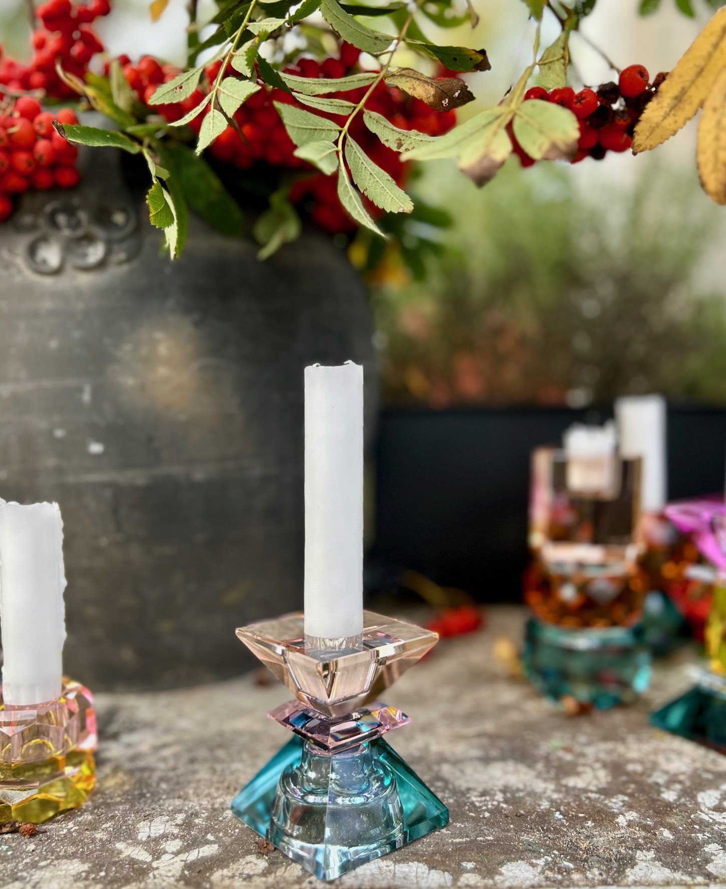 Ljusstake i genomfärgat glas i milda pastelliga färger, jättefin att blanda med de andra modellerna i serien, men förstås vacker helt ensam också. Vanliga kronljus passar till ljusstaken.