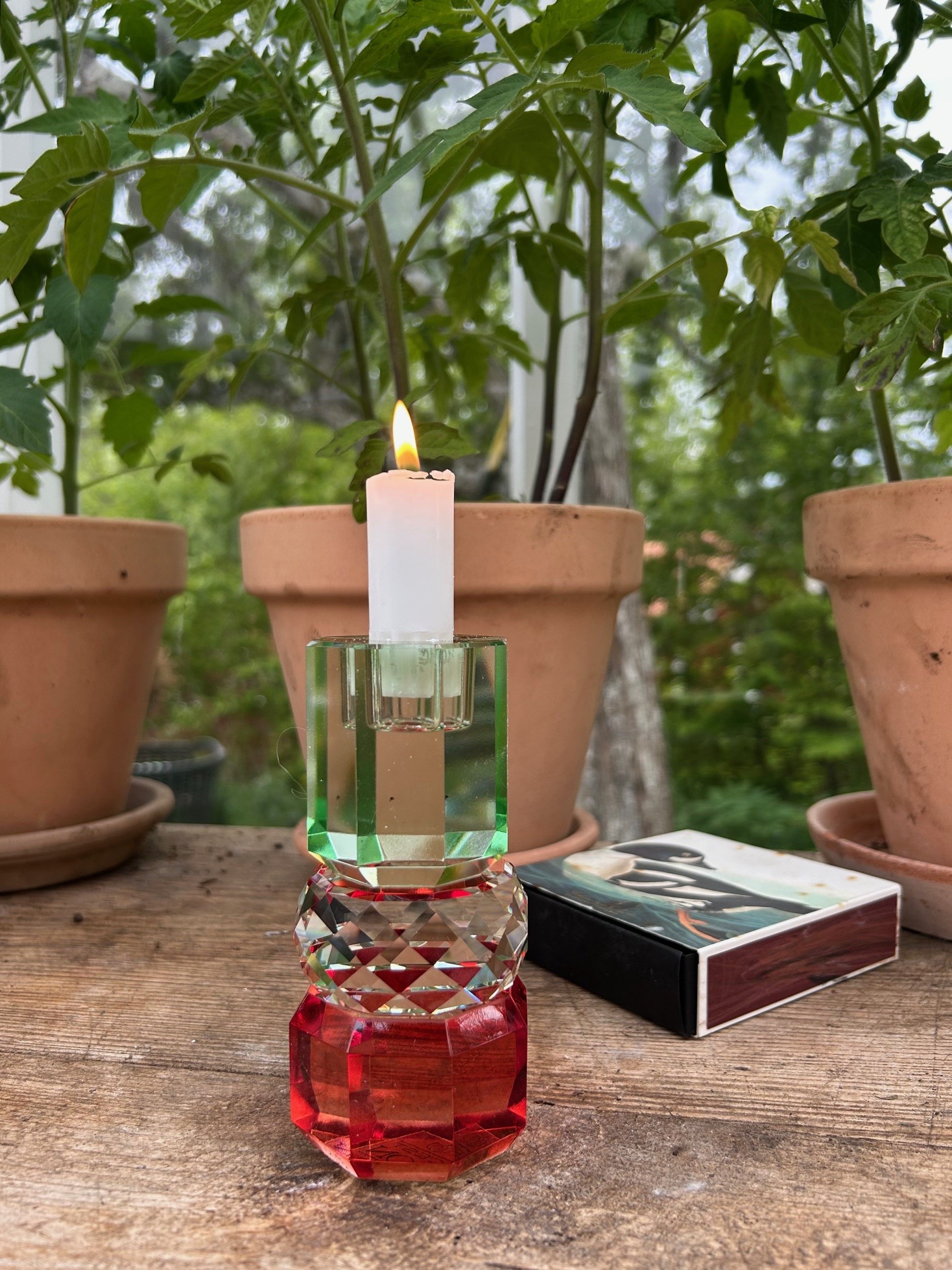 Ljusstake i genomfärgat glas i fin färgkombination, jättefin att blanda med de andra modellerna i serien, men förstås vacker helt ensam också. Vanliga kronljus passar till ljusstaken.