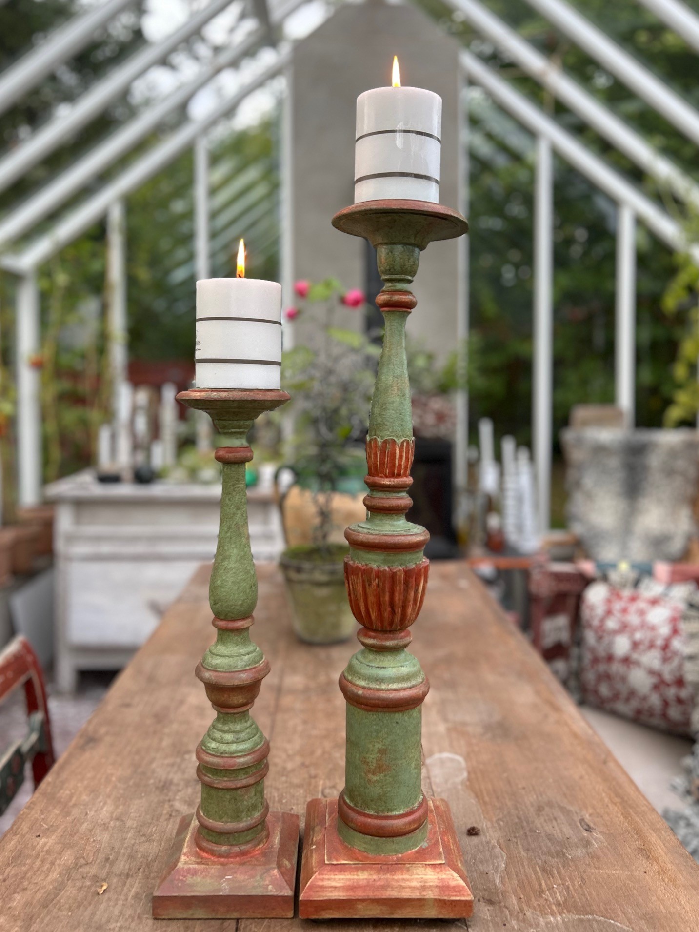 Dessa ljusstakar är gjorda för blockljus, sitter en liten ”pigg” längst upp för att hålla blockljuset stadigt på plats. Färgen är blek röd och antikgrön, två färger som blir otroligt vackra tillsammans.