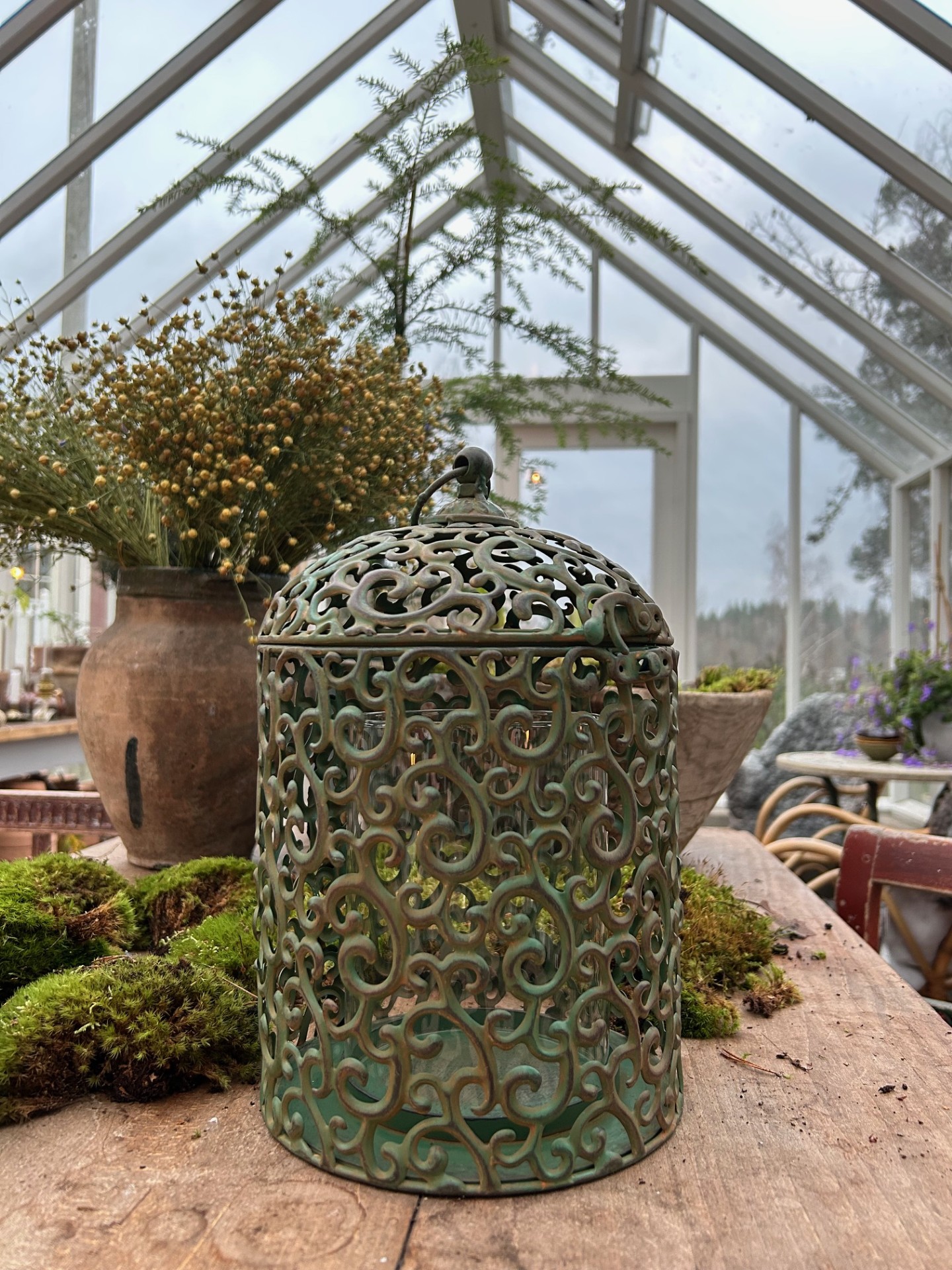 Sirlig lantern är en dekorativ ljuslykta i grönpatinerad smide, dess vackra mönster skapar ett vackert sken som silar ljuset fint. Lanternan kan även hängas i den lilla öglan upptill, i en ampelkrok. Ett cylinderglas följer med så att ett levande ljus står skyddat i lyktan, även fint att lägga en ljusslinga i lyktan om man inte vill använda levande ljus, det går förstås utmärkt att använda batteriljus.