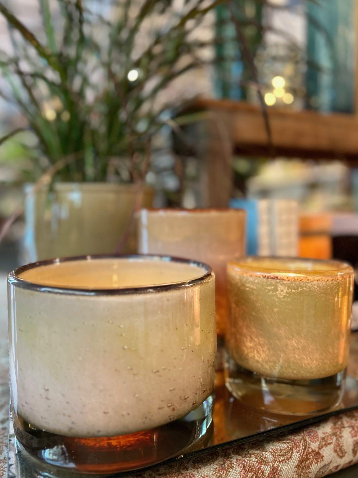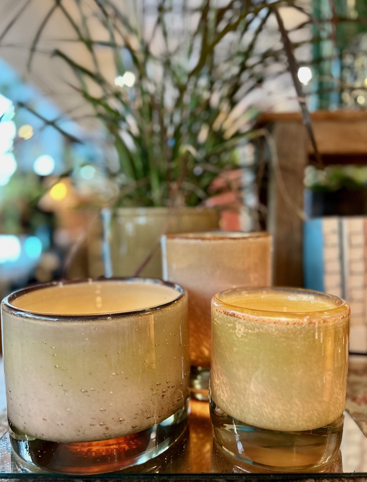 Verre Pulce är precis som vårt övriga stora Verre sortiment munblåsta av returglas, men Pulce serien har mycket mer glas i sig med kraftig botten och tjockare glas. I Pulce serien förekommer inga bubblor i glaset utan istället många färgskiftningar i brända jordiga toner med en bas i mörkt gult åt det beige hållet med inslag av brunt, sand, aubergine.