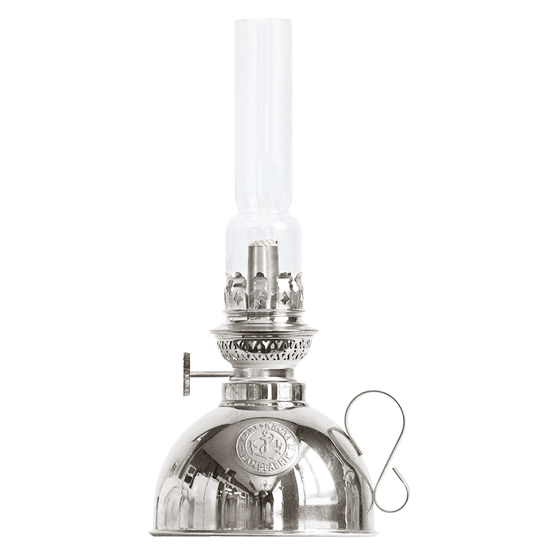 Fotogenlampa tillverkad i dragen och trycksvarvad mässing. Försedd med en 6^ rundbrännare. Delarna är standardiserade efter det traditionella franska linjesystemet, vilket gör att delarna kan bytas om de slits ut. Oljehuset rymmer drygt 3 dl fotogen vilket räcker i ca 17 timmar.
