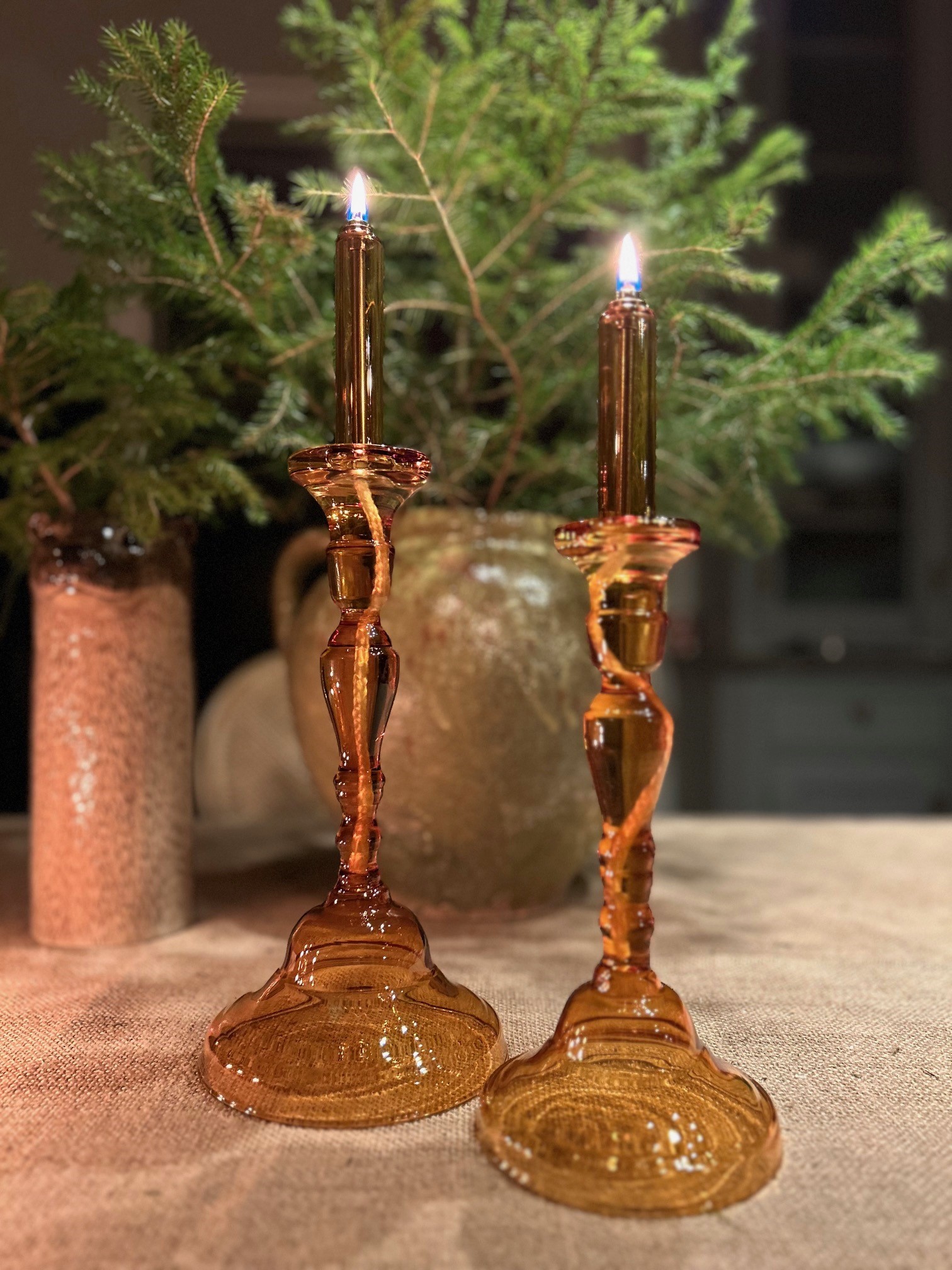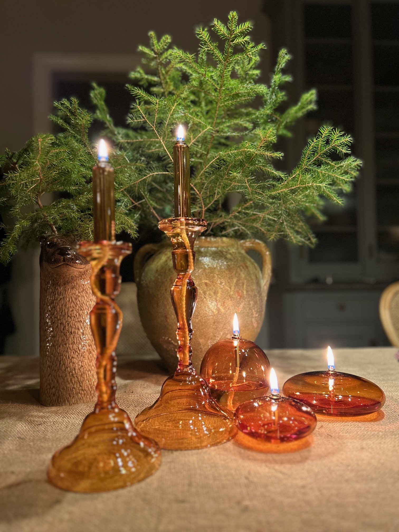 Oljelampa i amberfärgat glas i ljusstake form, finns i två olika storlekar.
