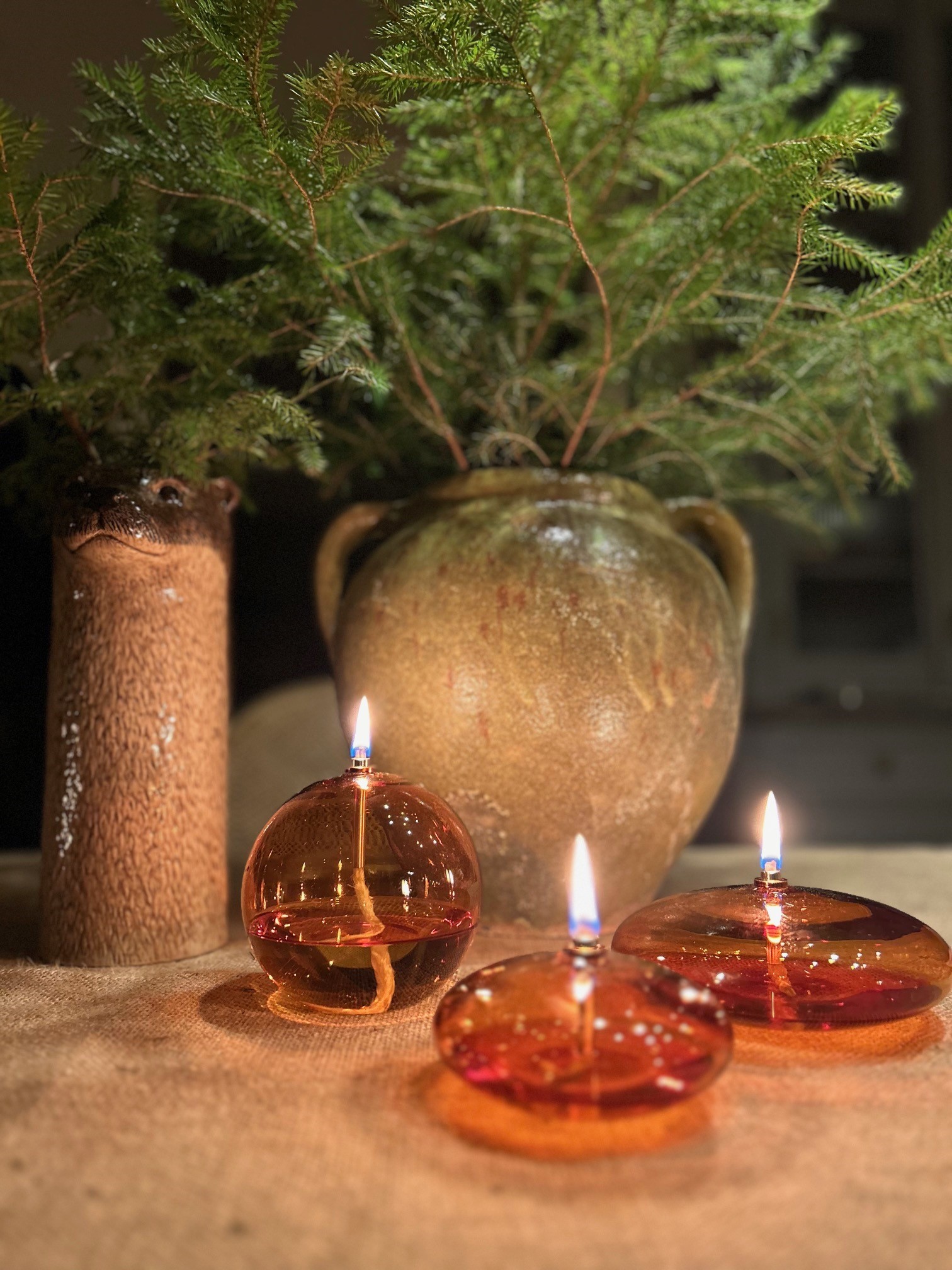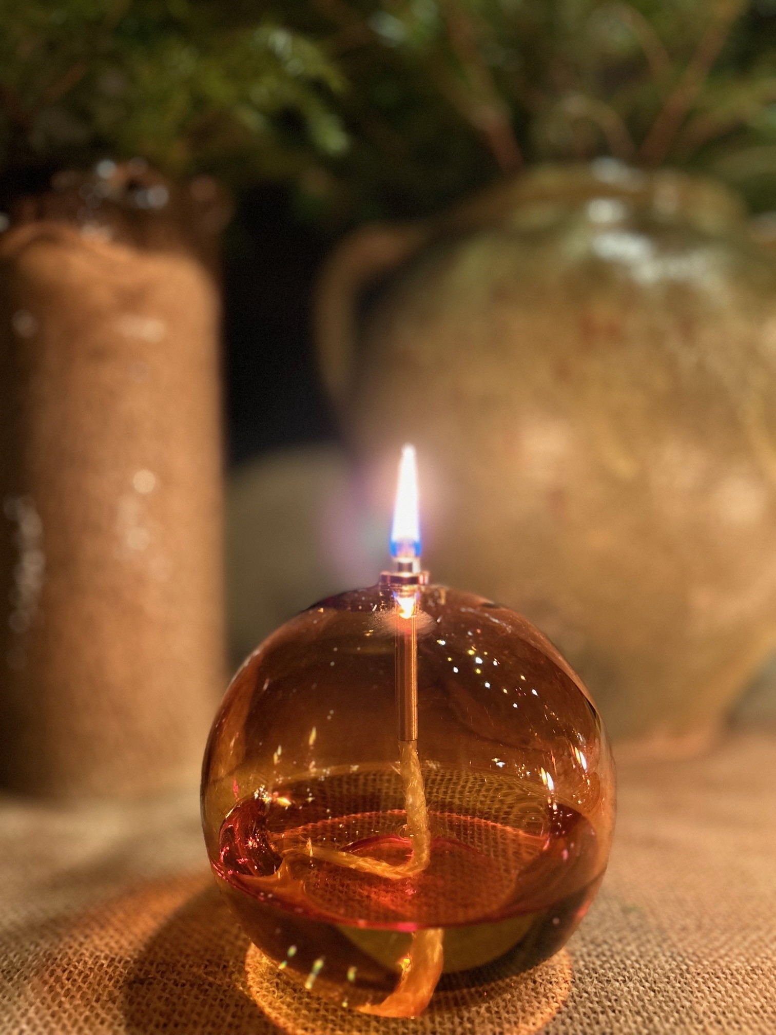 Veken är gjord av glasfiber och behöver ej bytas ut. Fyll behållaren med lampolja upp till 3/4 i glaset.
